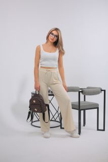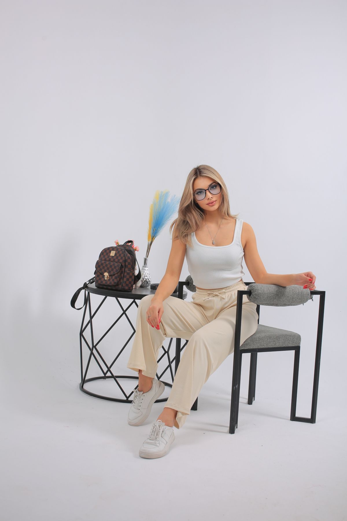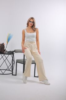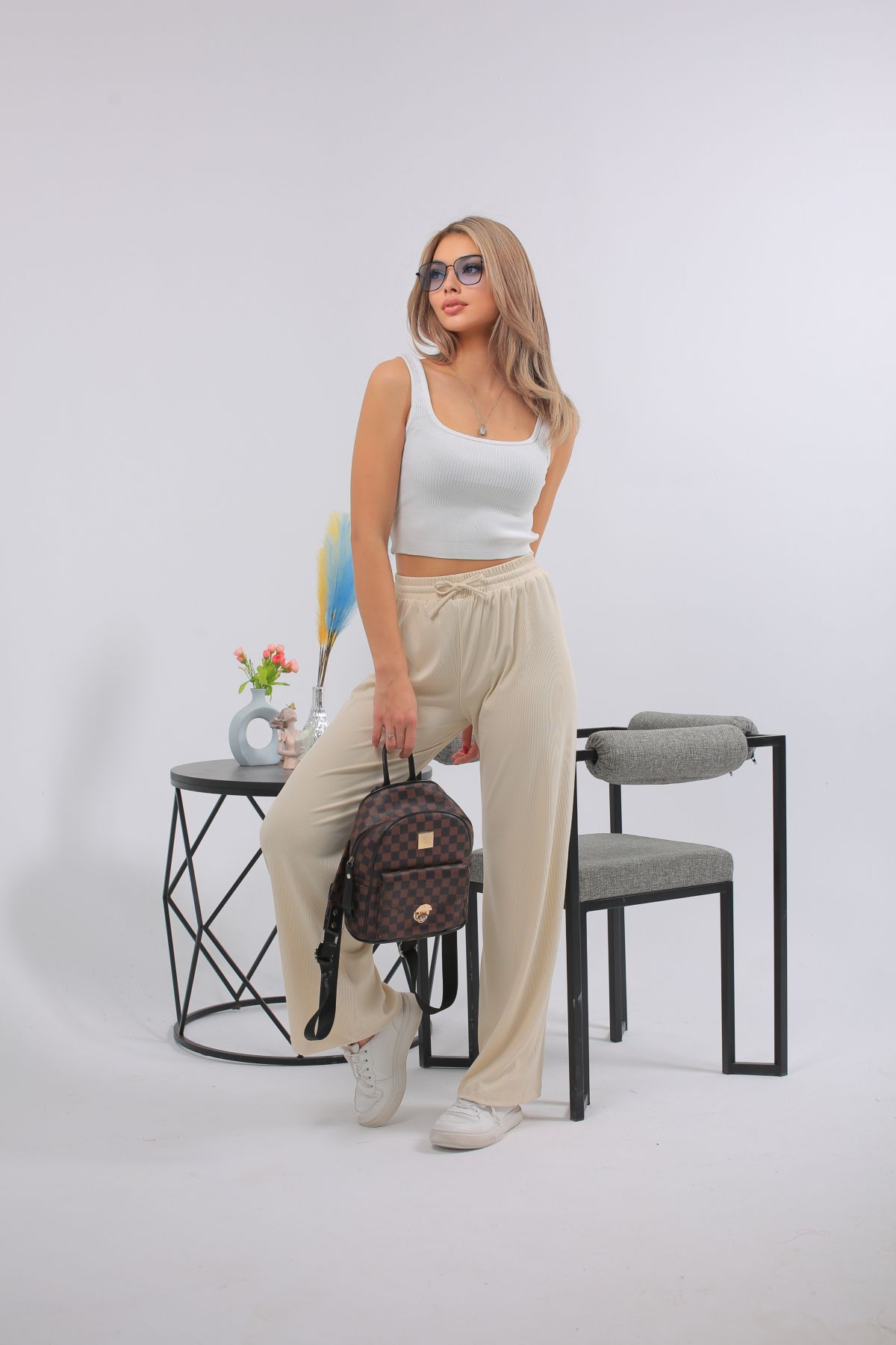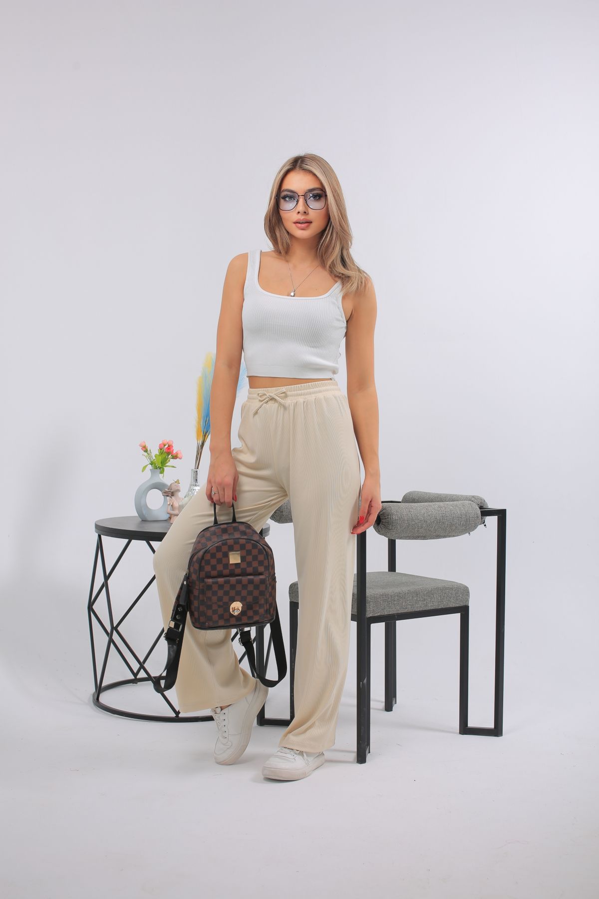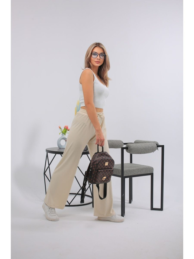 Женские брюки палаццо бежевого цвета: свободный крой, высокая посадка и мягкий материал. Перейти к описанию