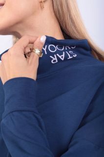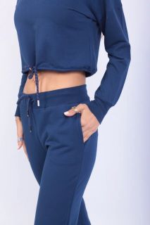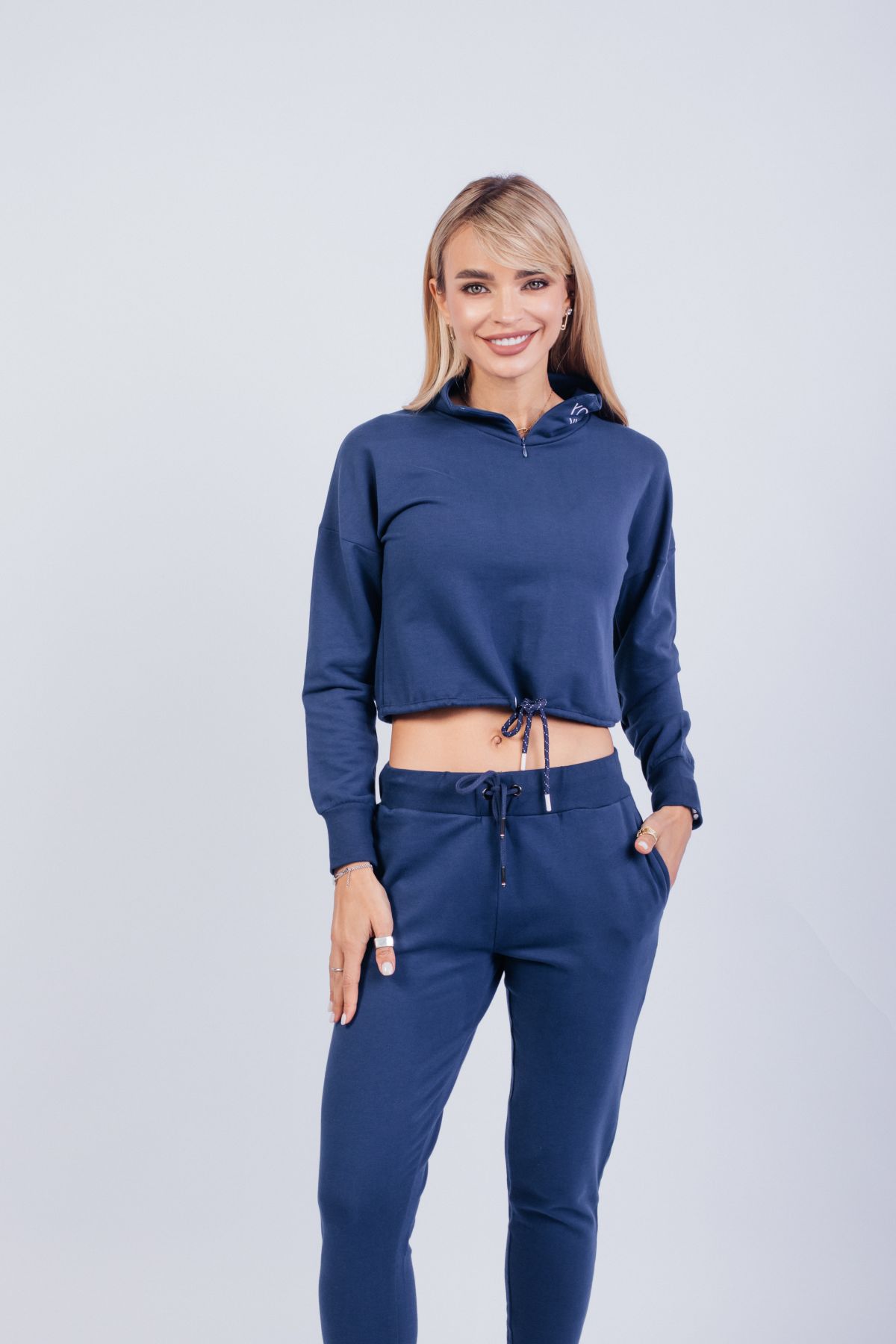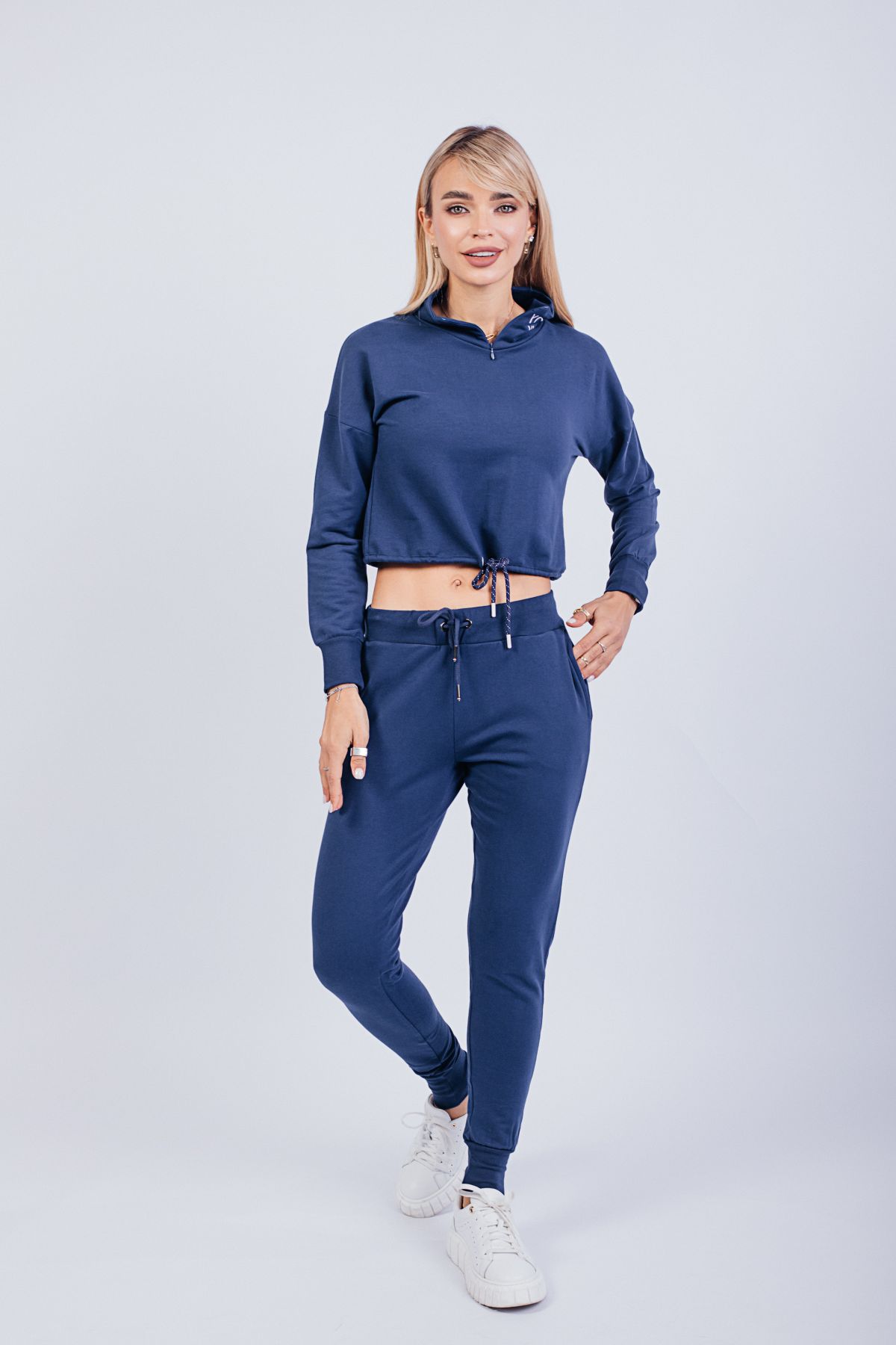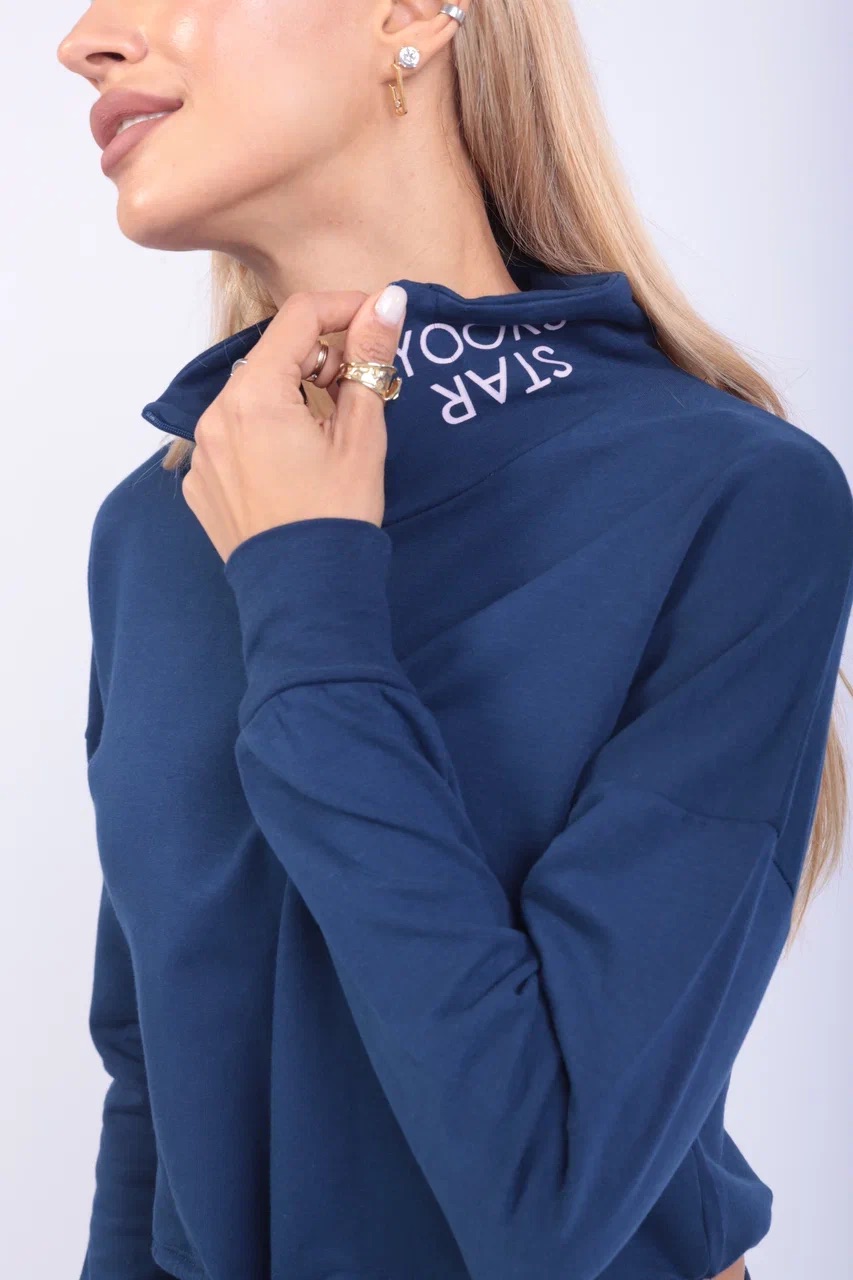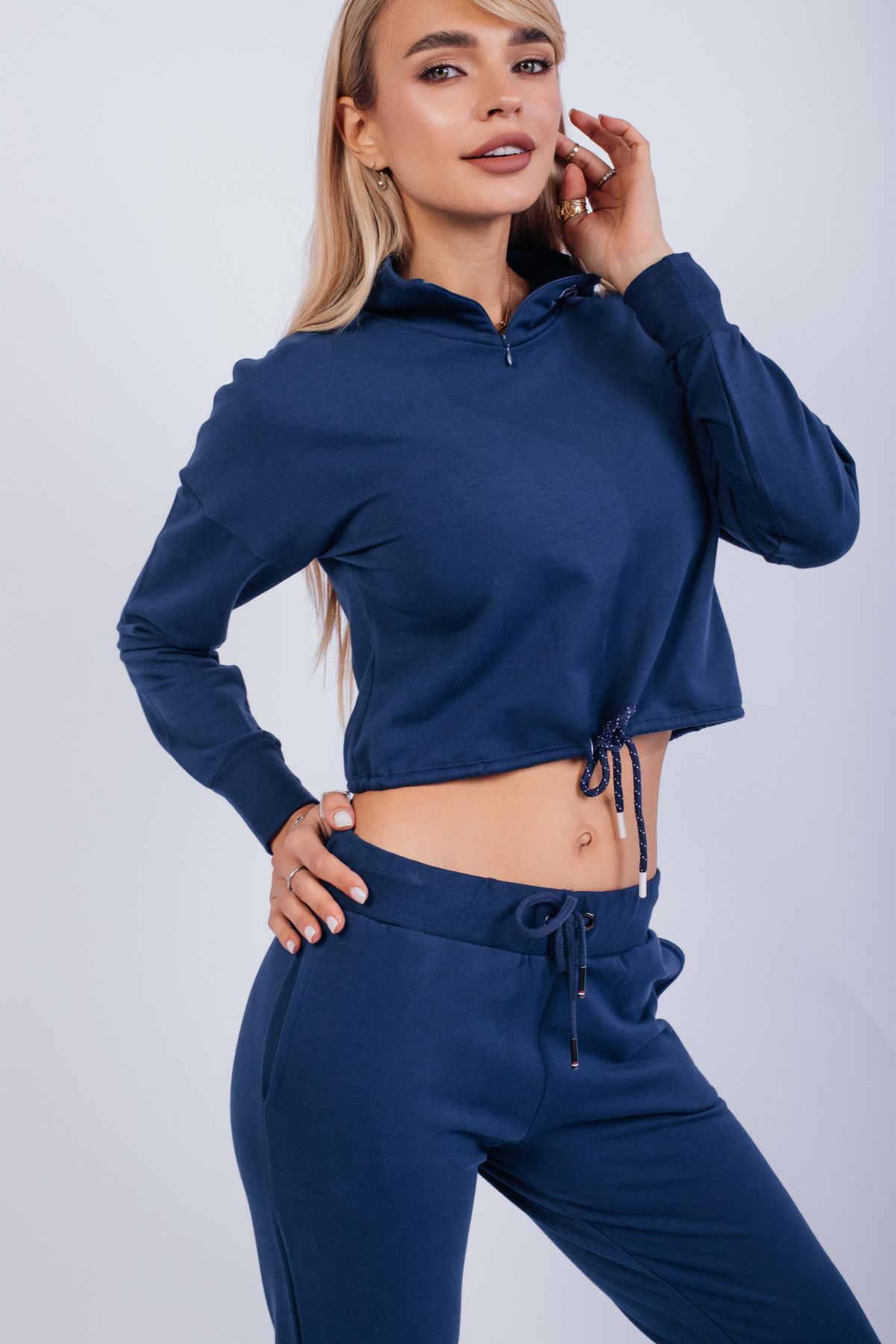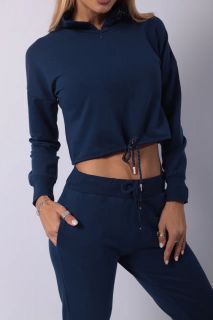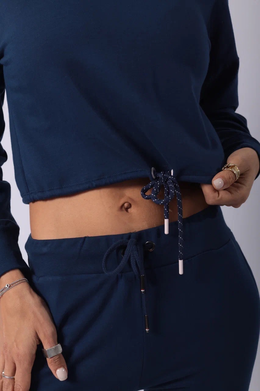 Тёмно-синий спортивный костюм с укороченным худи — стильный выбор для тех, кто ценит свободу движений и визуальную лёгкость. Верх на молнии с высоким воротом и кулиской подчёркивает талию и добавляет спортивного акцента. Брюки с высокой посадкой и регулируемой талией делают посадку комфортной и универсальной. Идеален для прогулок, поездок, домашнего отдыха и стильных выходов на каждый день. Ткань — мягкий трикотаж средней плотности.