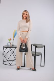 Женский спортивный костюм кремового цвета: лонгслив-кроп и прямые брюки с завязкой. Перейти к описанию