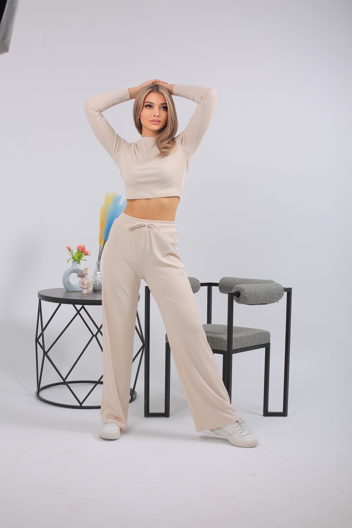 Кремовый спортивный костюм — must-have для тех, кто выбирает комфорт, но не готов жертвовать стилем. Укороченный лонгслив с длинным рукавом отлично сочетается с брюками свободного кроя на завязке. Лёгкий, мягкий трикотаж с вертикальной фактурой делает посадку максимально приятной. Цвет — универсальный, светлый и идеально вписывается в базовый гардероб. Подходит для прогулок, повседневной носки и стильных домашних дней.