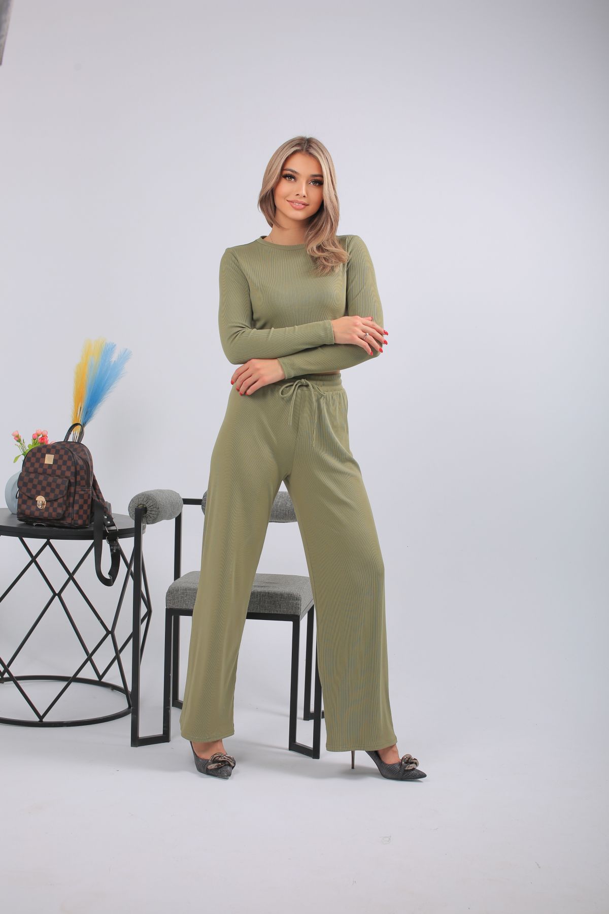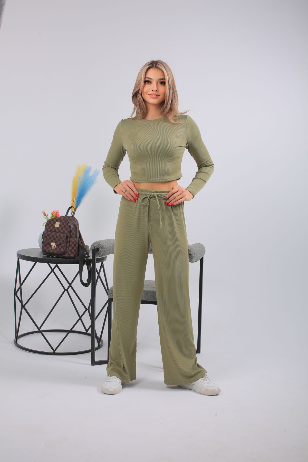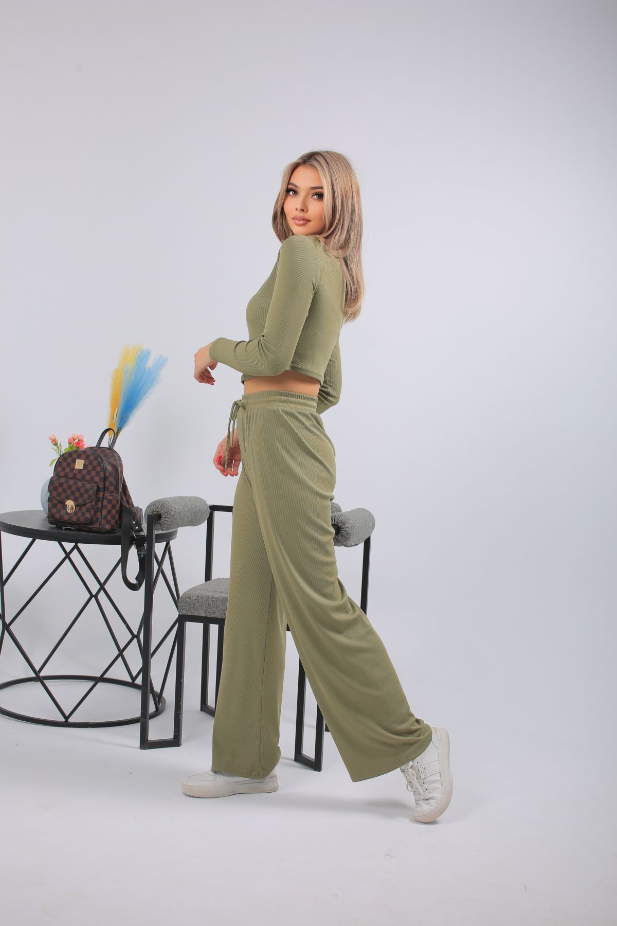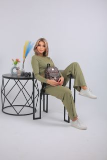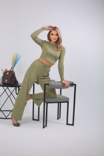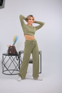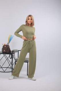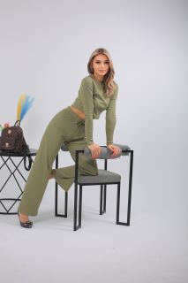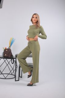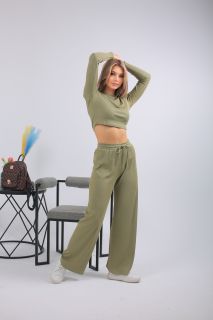 Спортивный костюм в трендовом оливковом оттенке — выбор для тех, кто предпочитает стильный комфорт каждый день. Комплект включает кроп-топ с длинным рукавом и широкие брюки с высокой посадкой на мягкой резинке. Выполнен из лёгкого, эластичного трикотажа с рельефной фактурой. Отлично подойдёт для прогулок, отдыха, поездок или домашнего расслабления. Цвет сдержанный, универсальный, подчёркивающий вкус.