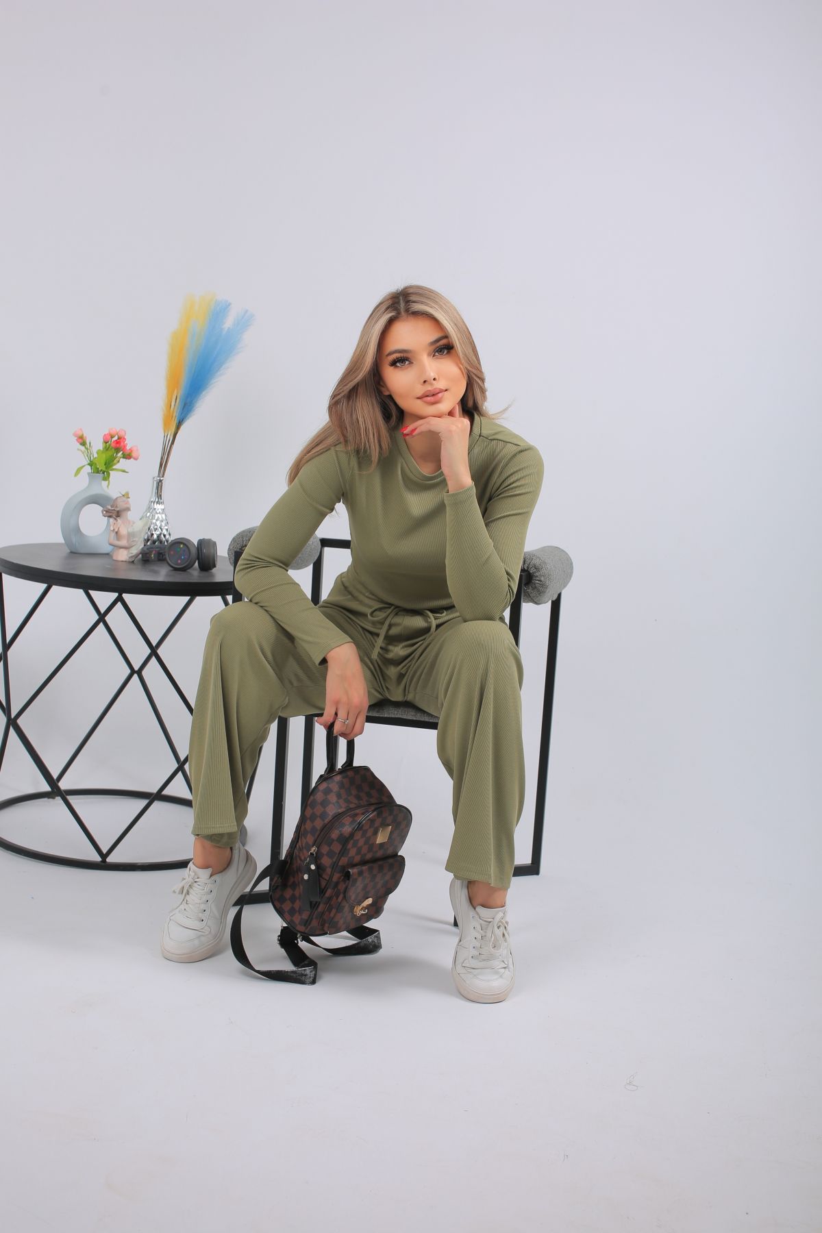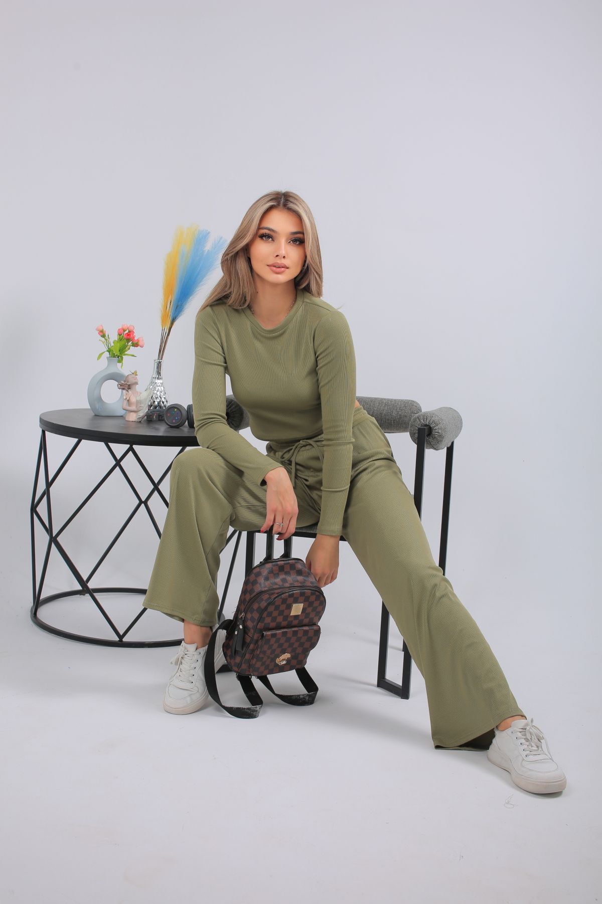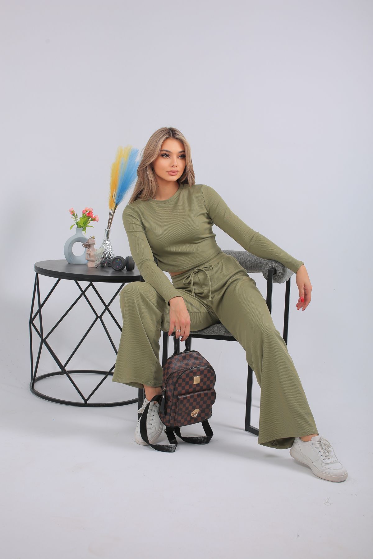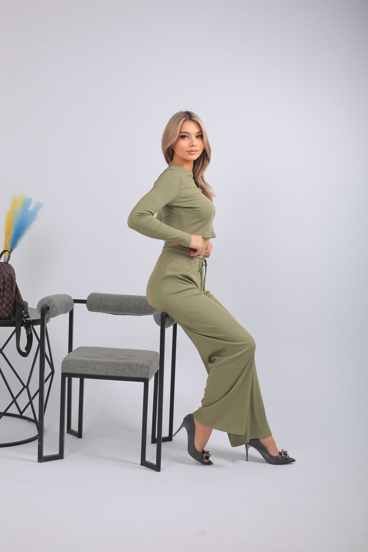 Спортивный костюм в трендовом оливковом оттенке — выбор для тех, кто предпочитает стильный комфорт каждый день. Комплект включает кроп-топ с длинным рукавом и широкие брюки с высокой посадкой на мягкой резинке. Выполнен из лёгкого, эластичного трикотажа с рельефной фактурой. Отлично подойдёт для прогулок, отдыха, поездок или домашнего расслабления. Цвет сдержанный, универсальный, подчёркивающий вкус.