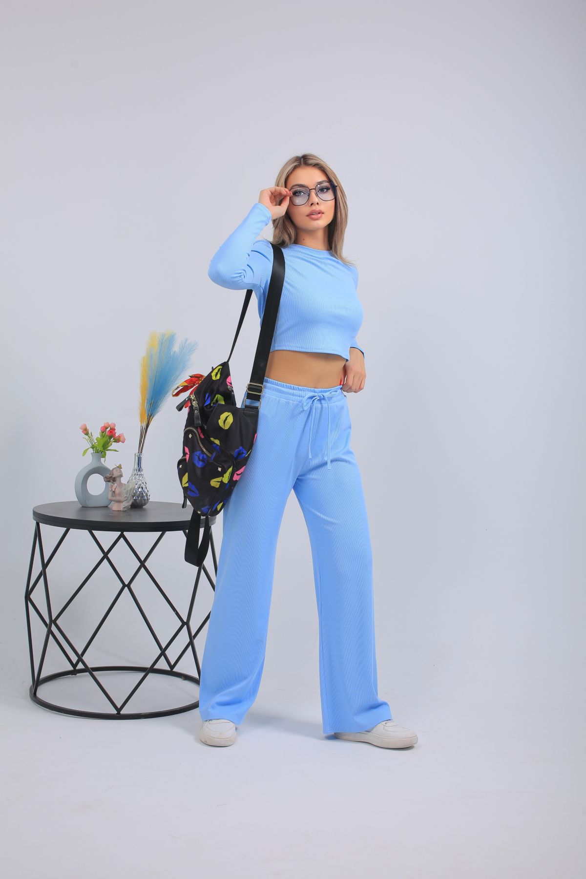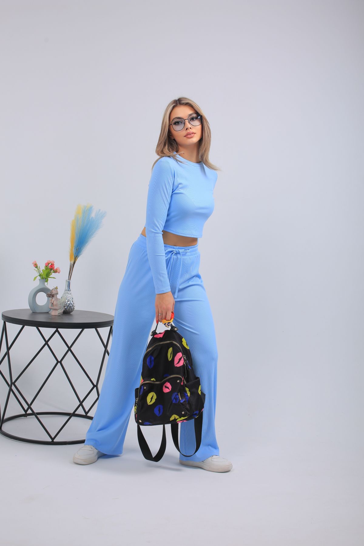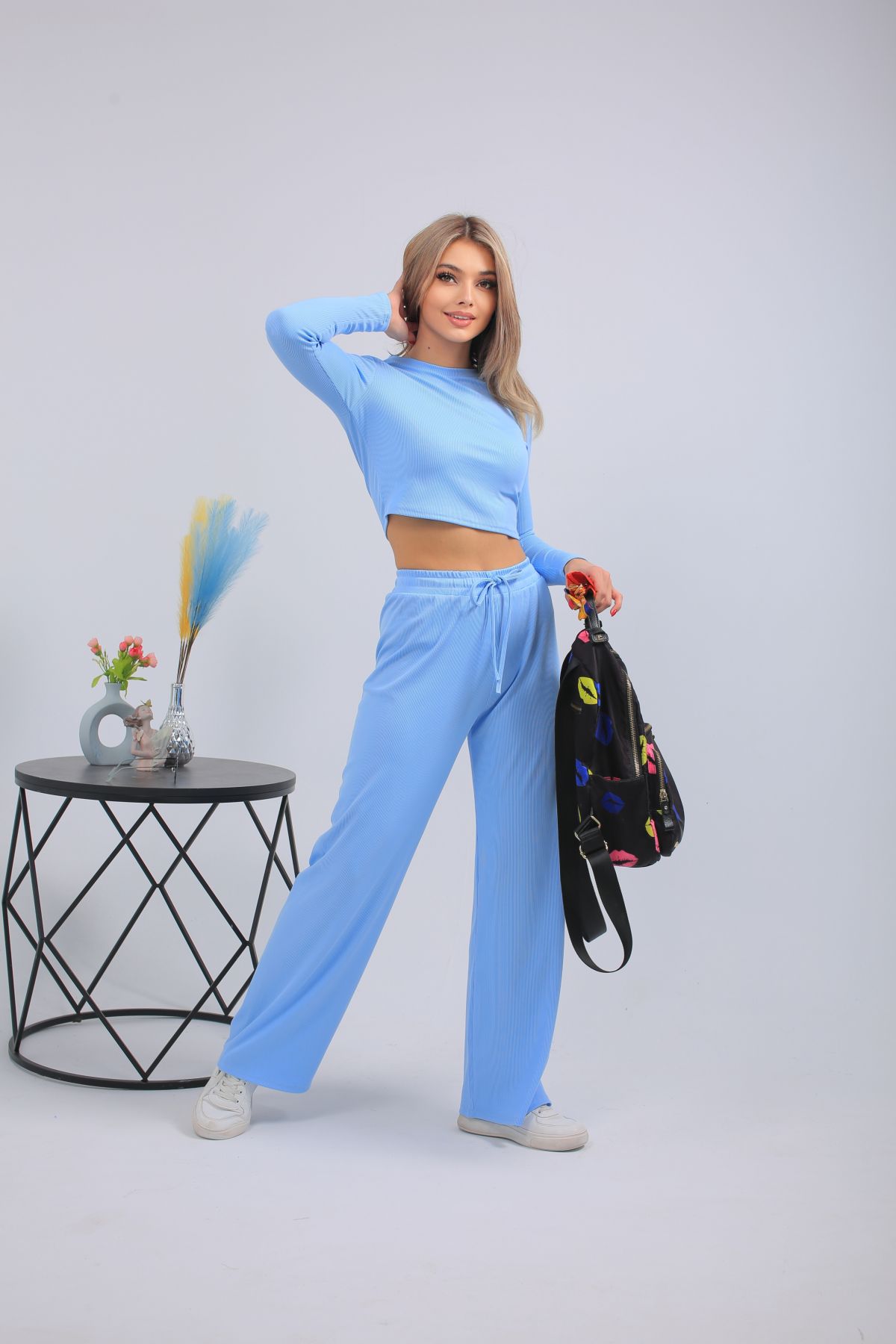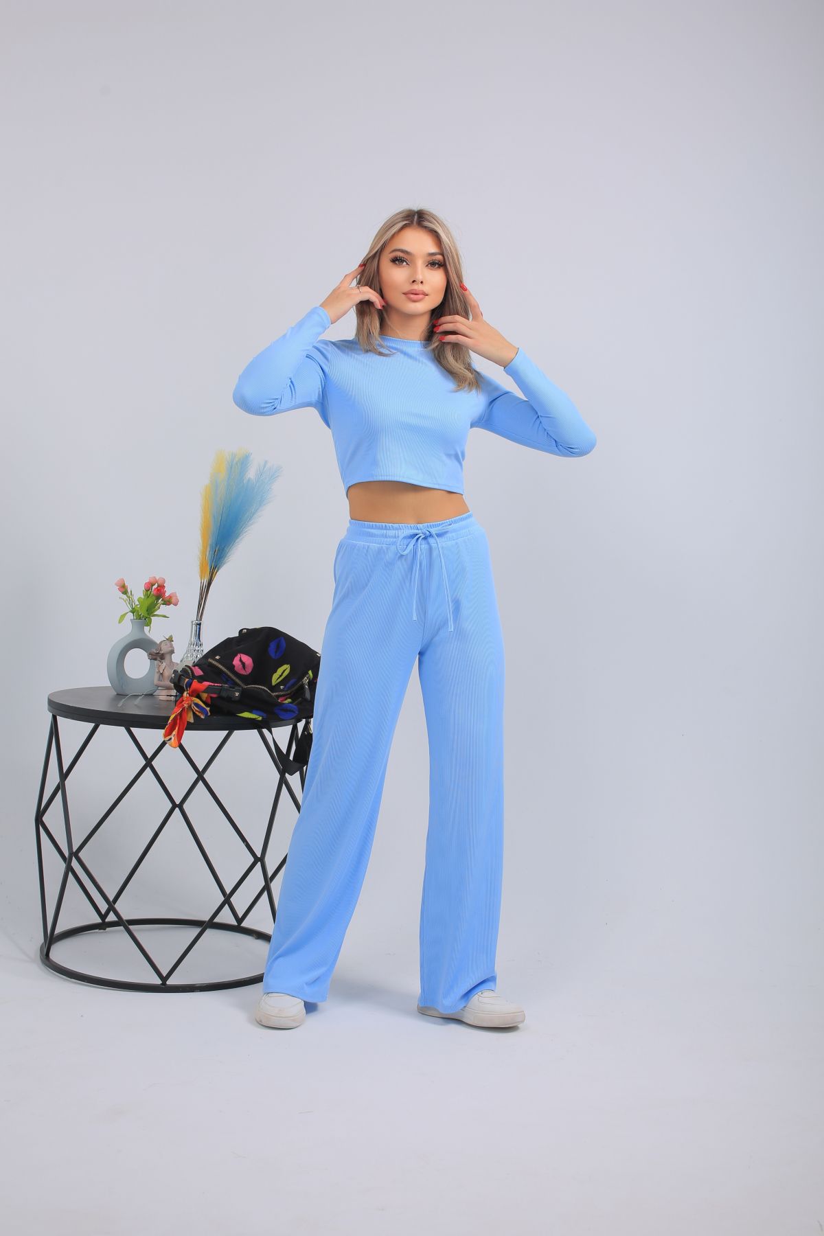 Женский спортивный костюм: укороченный лонгслив и широкие брюки на резинке в голубом цвете. Перейти к описанию