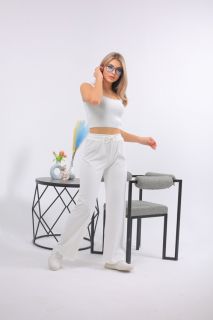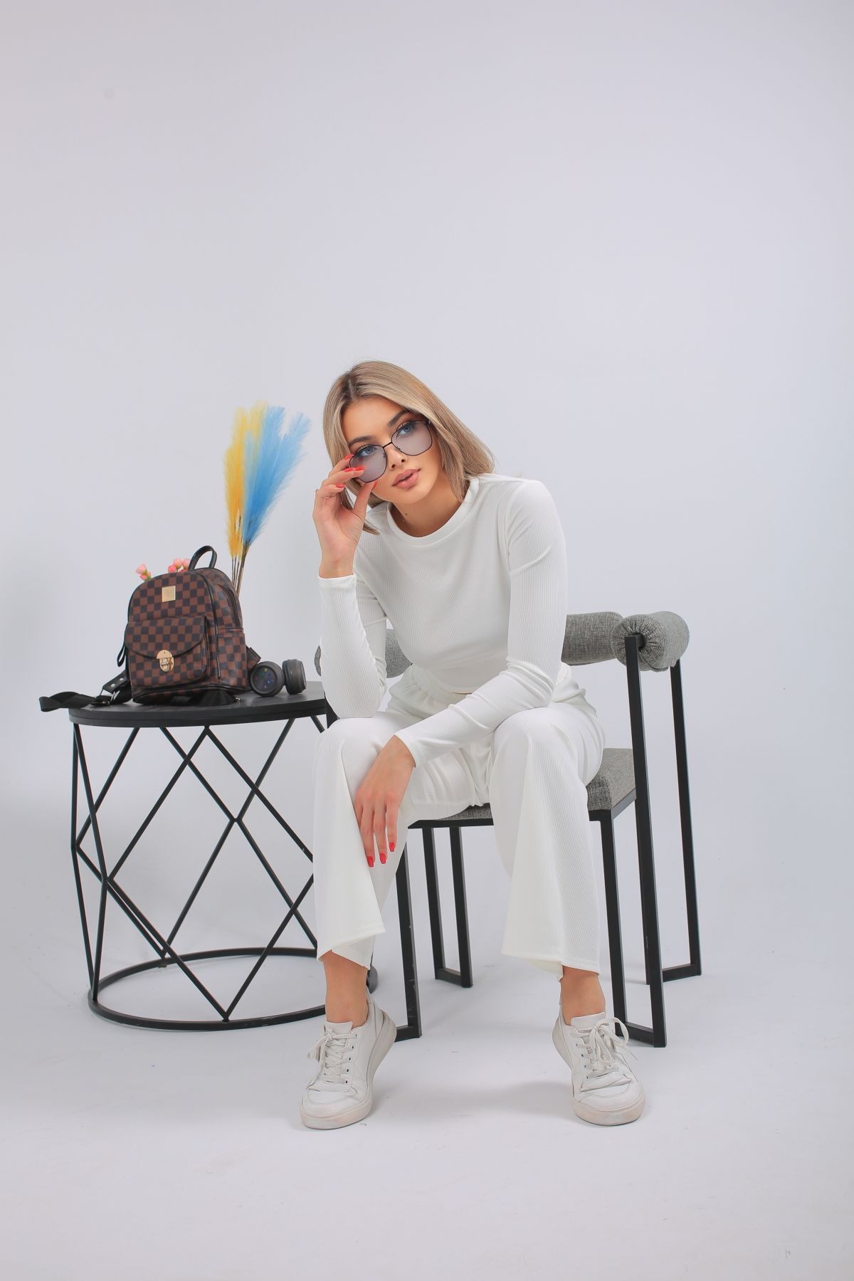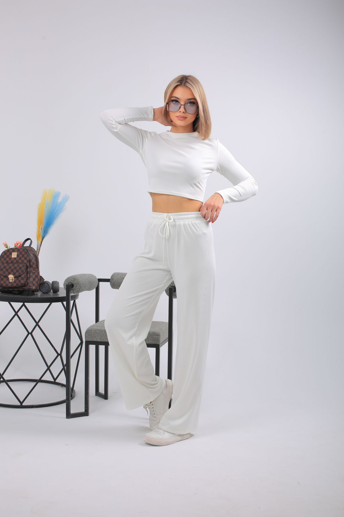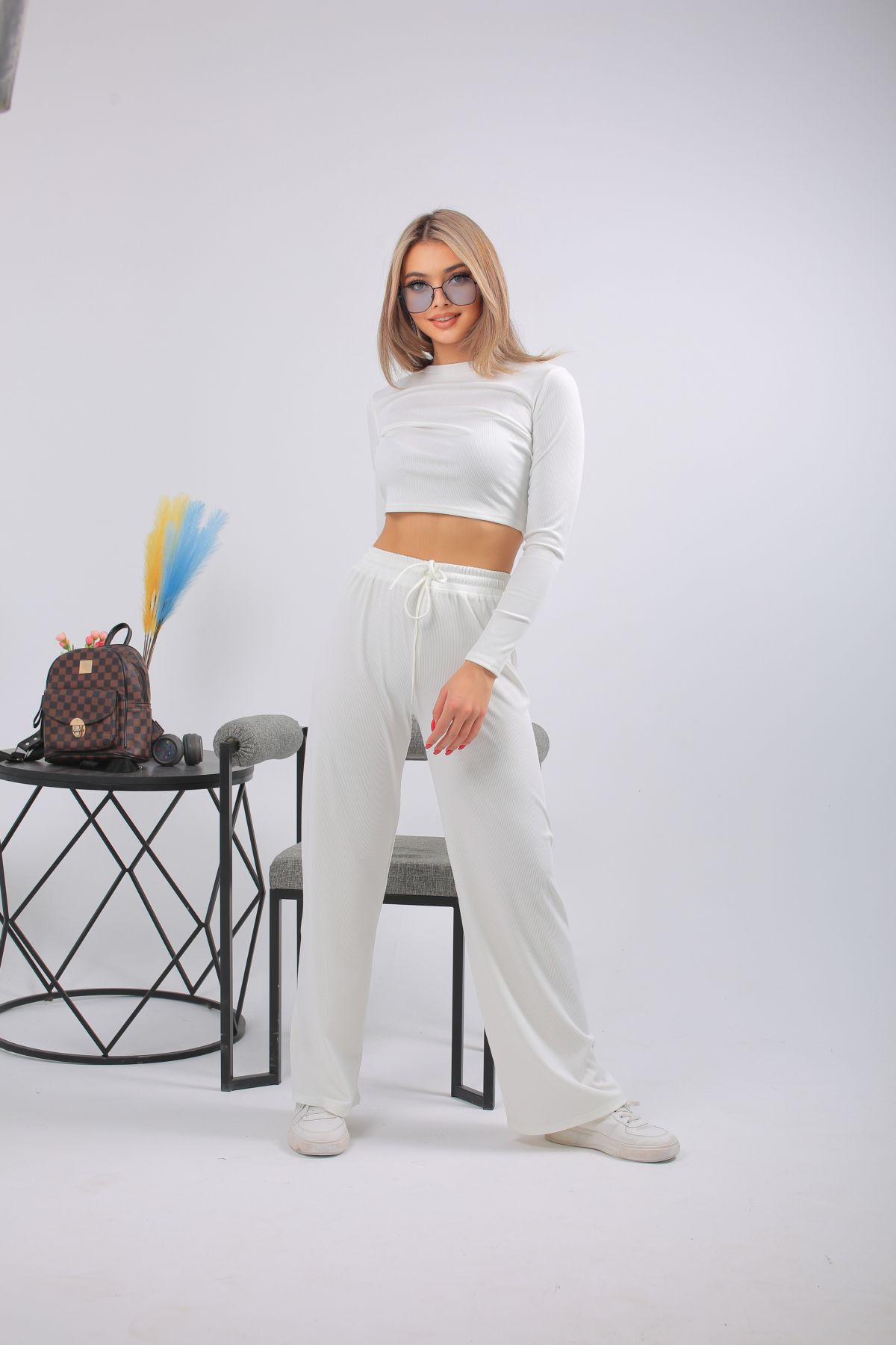 Белый спортивный костюм с кроп-топом и прямыми брюками — это образ «всё могу, но сначала кофе». Верх — укороченный лонгслив с длинным рукавом, низ — брюки свободного кроя на талии со шнурком. Эластичный, мягкий трикотаж в рифлёную текстуру комфортен на каждый день. Идеально для прогулок, домашнего уюта и стильных выходов. Белый цвет — всегда актуален и добавляет лёгкости.