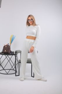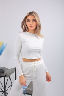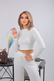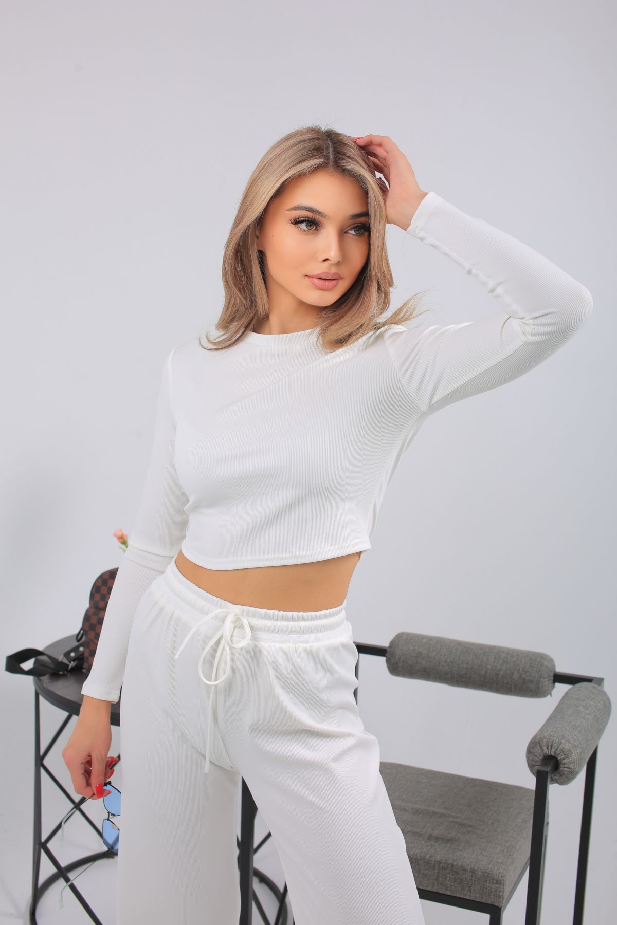 Женский спортивный костюм белого цвета: кроп-топ с длинным рукавом и прямые брюки на шнурке. Перейти к описанию
