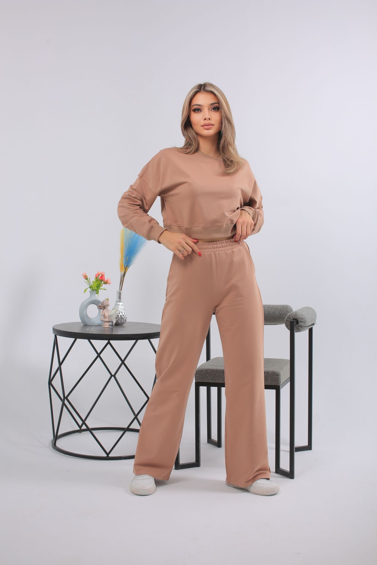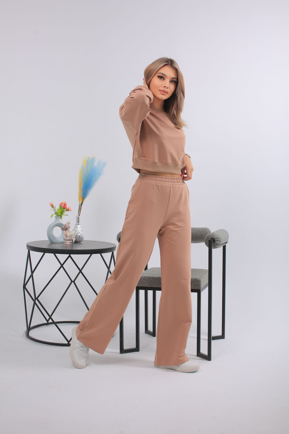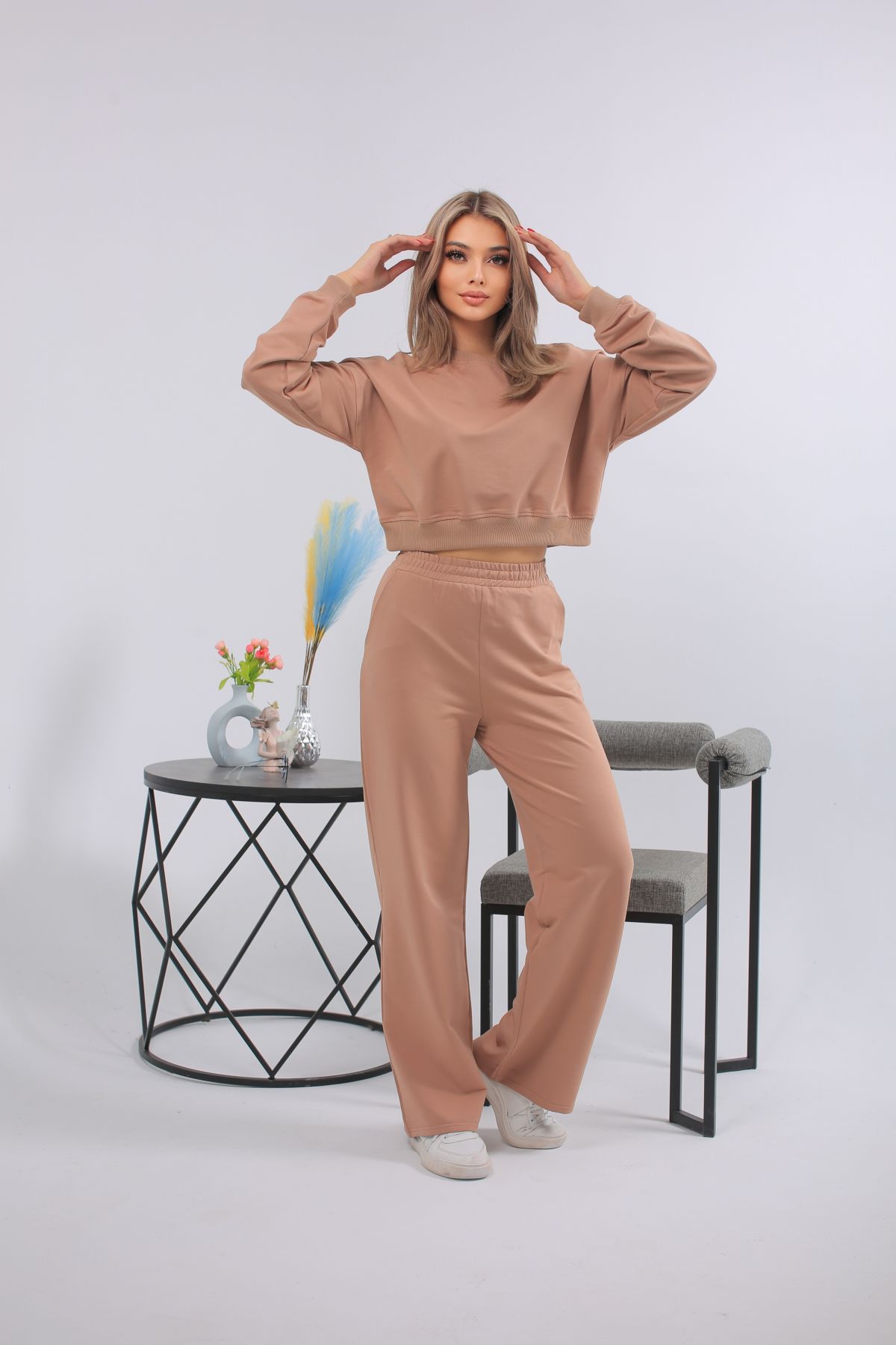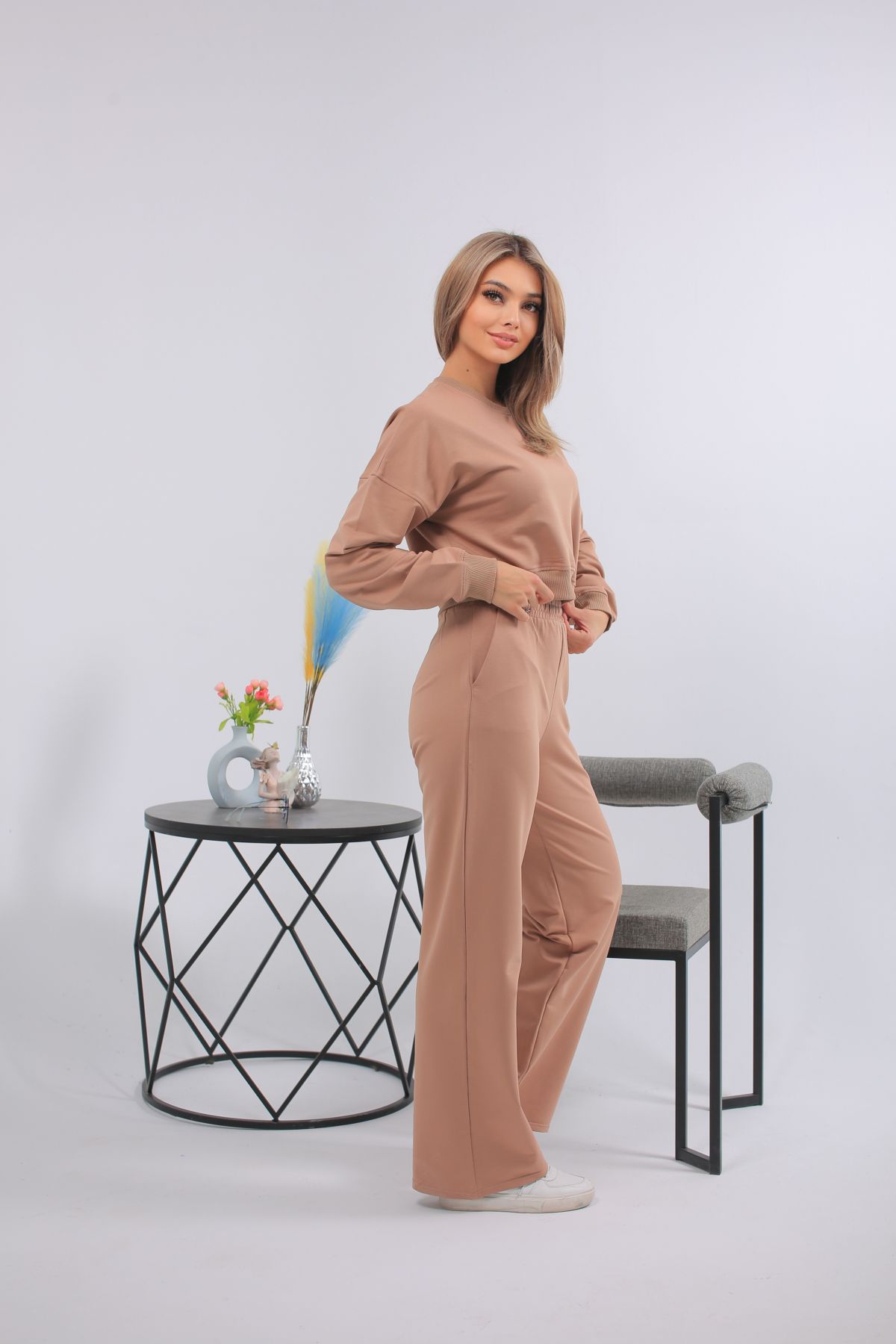 Трендовый женский костюм в тёплом бежево-карамельном оттенке — must-have для тех, кто ценит уют и элегантность. Комплект состоит из укороченного свитшота с эластичной резинкой по низу и брюк свободного кроя с высокой посадкой. Мягкий, эластичный трикотаж обеспечивает комфорт в течение дня. Костюм отлично подойдёт для прогулок, встреч с друзьями, офиса в стиле «casual» или домашнего отдыха. Базовая модель на каждый день, которую легко комбинировать с аксессуарами и обувью