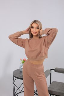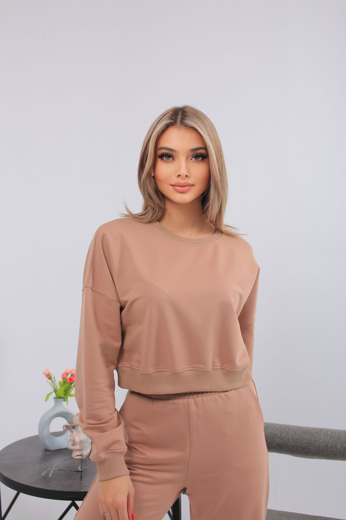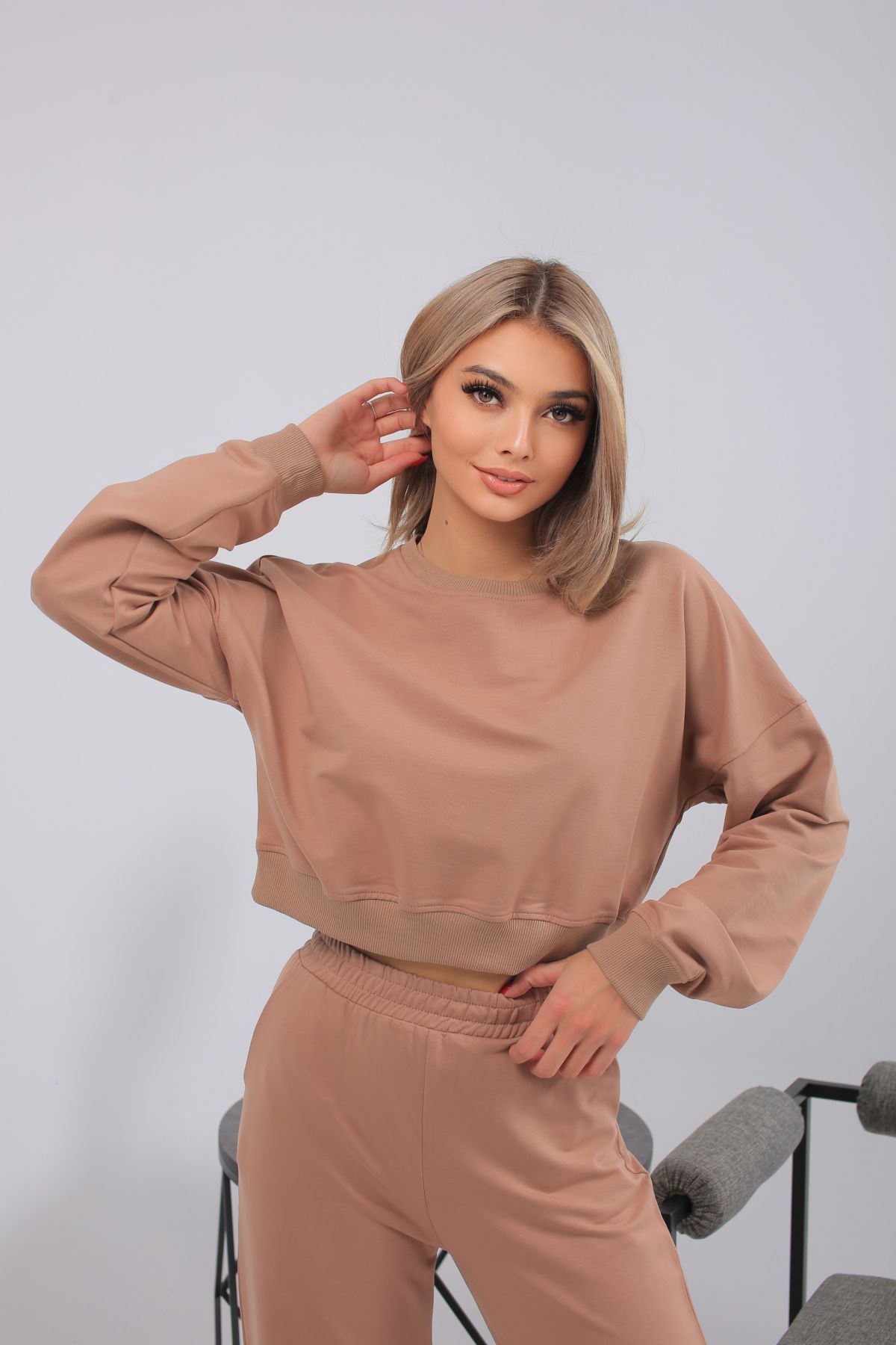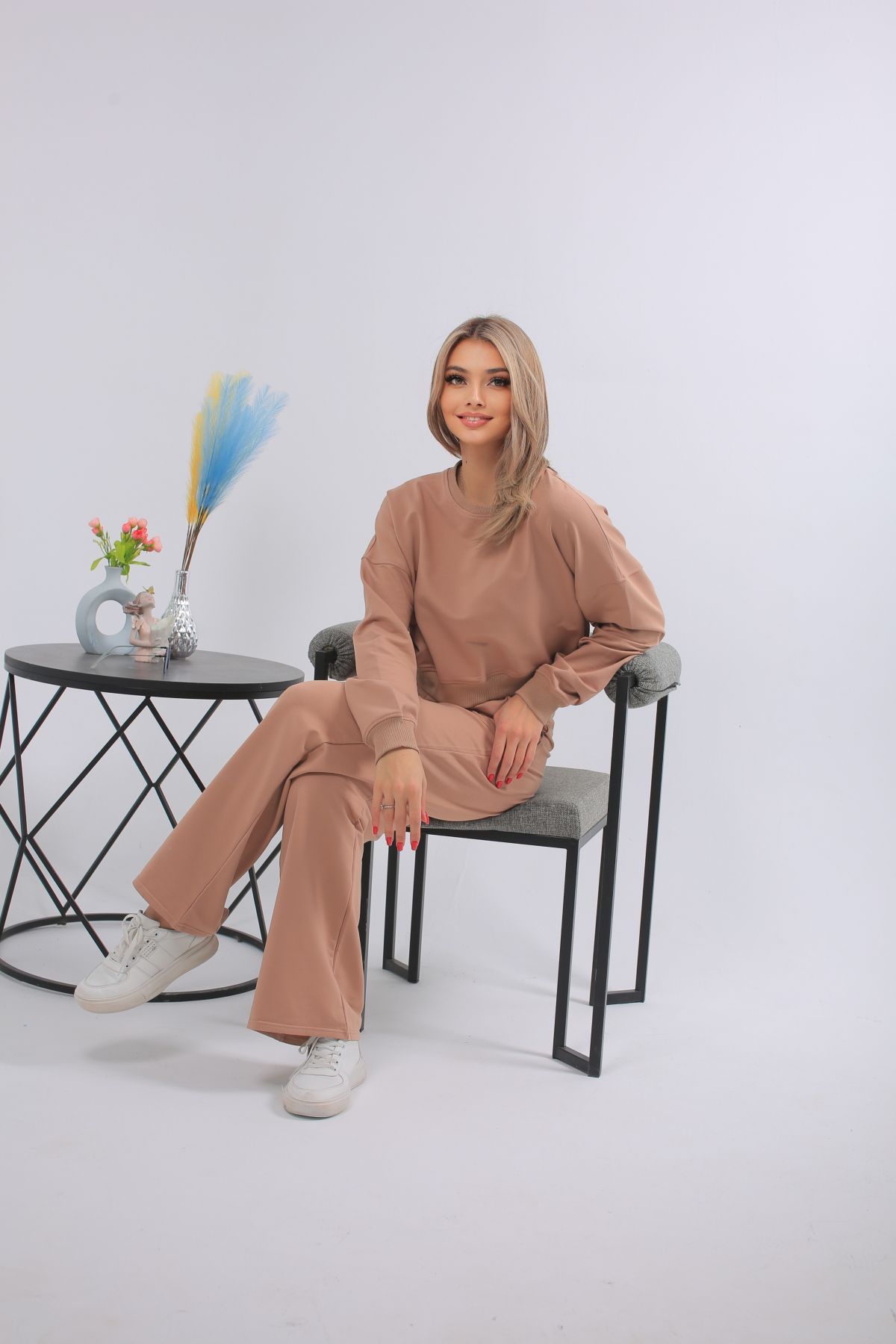 Трендовый женский костюм в тёплом бежево-карамельном оттенке — must-have для тех, кто ценит уют и элегантность. Комплект состоит из укороченного свитшота с эластичной резинкой по низу и брюк свободного кроя с высокой посадкой. Мягкий, эластичный трикотаж обеспечивает комфорт в течение дня. Костюм отлично подойдёт для прогулок, встреч с друзьями, офиса в стиле «casual» или домашнего отдыха. Базовая модель на каждый день, которую легко комбинировать с аксессуарами и обувью