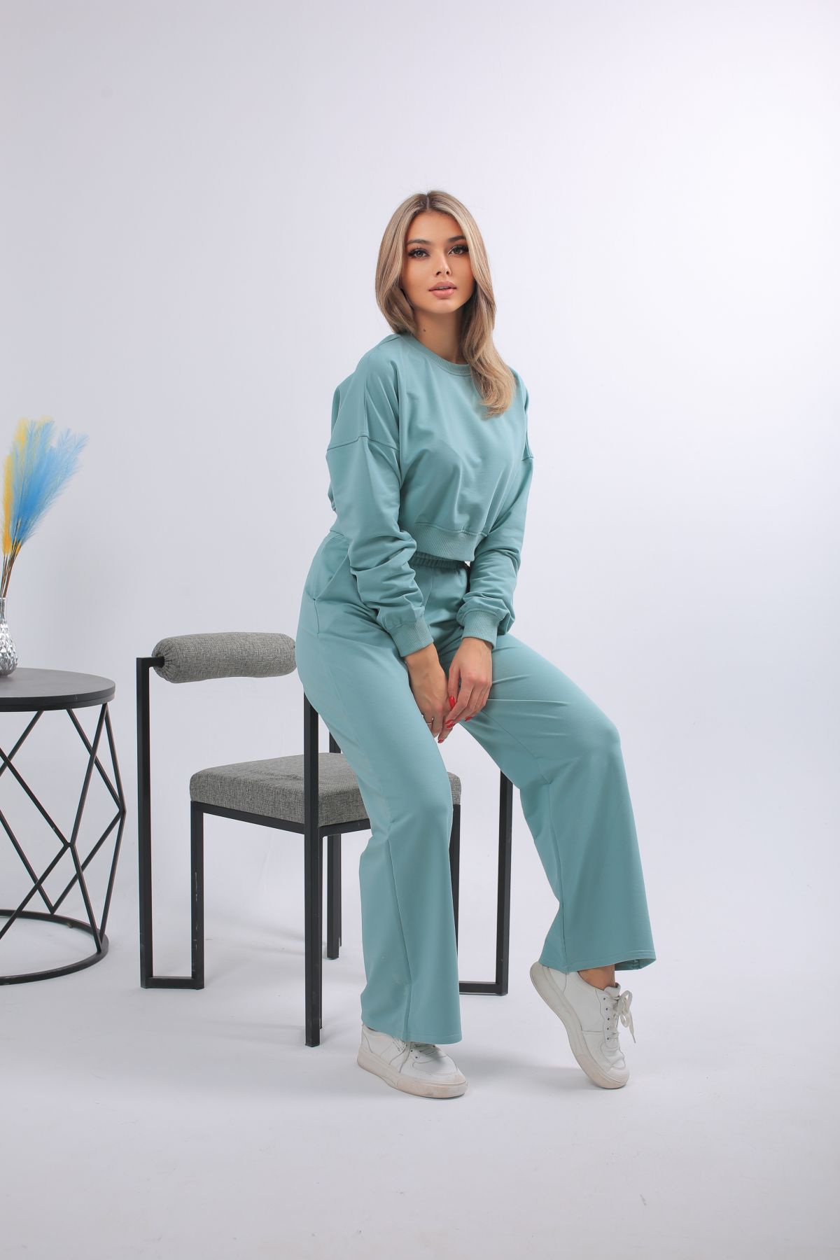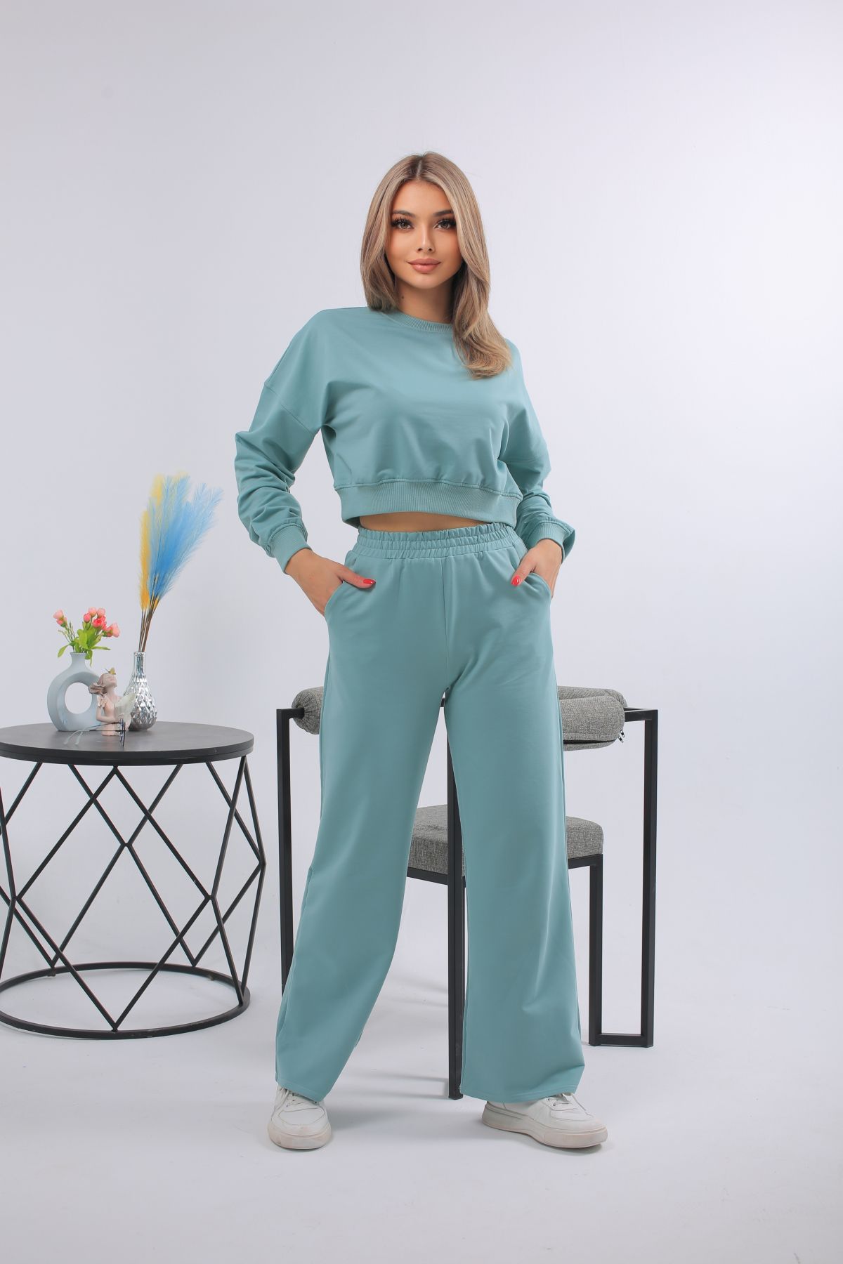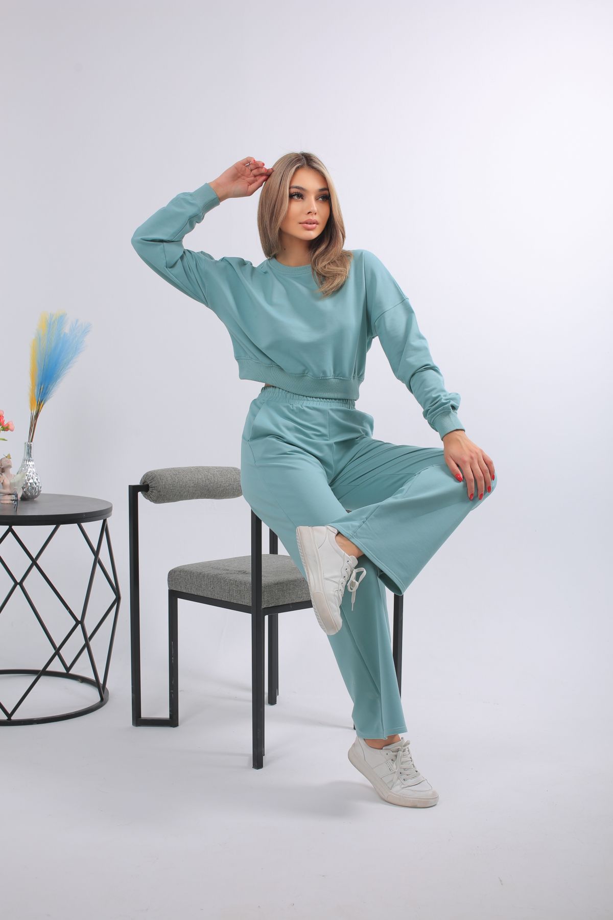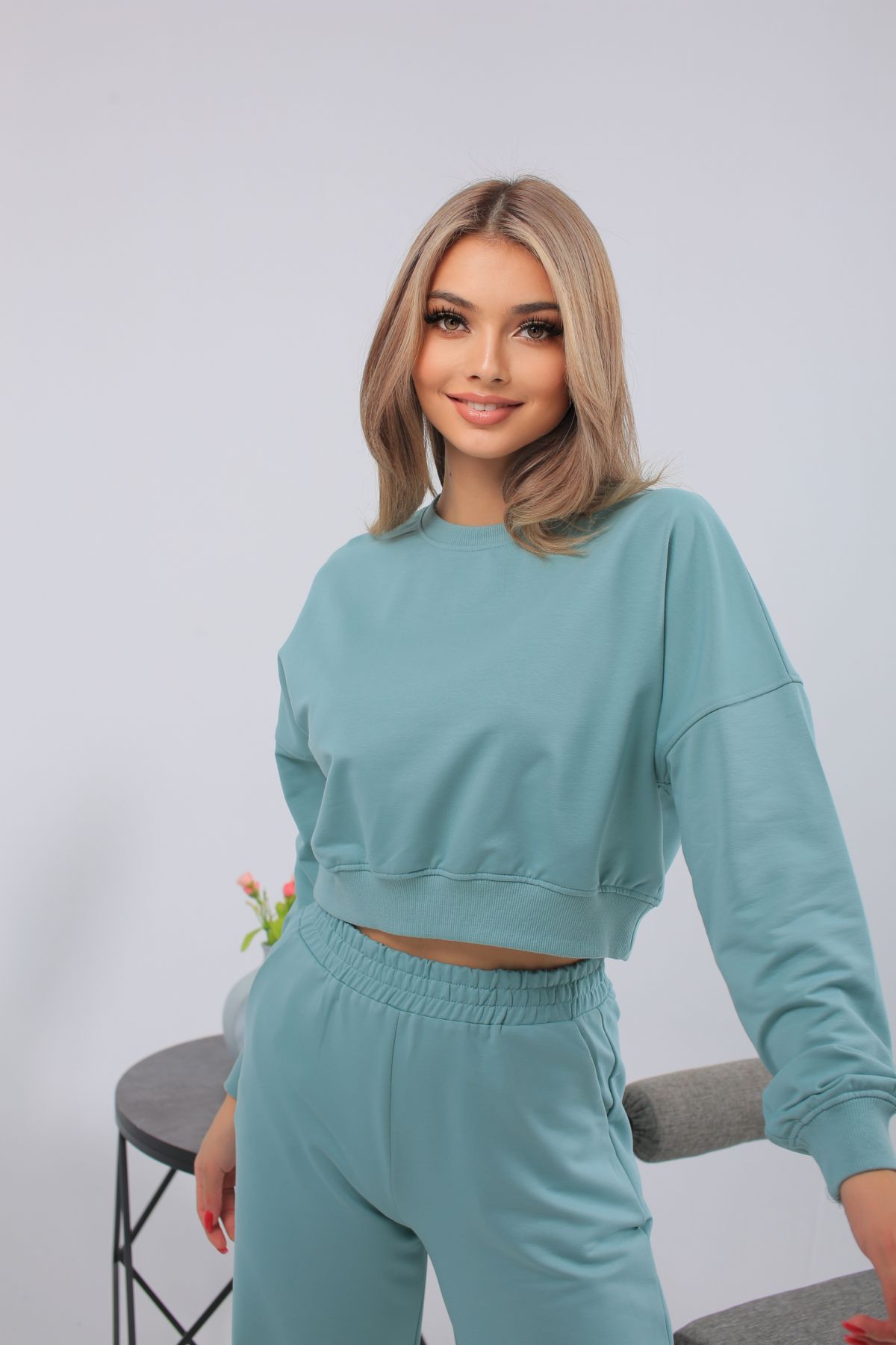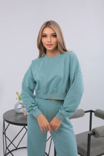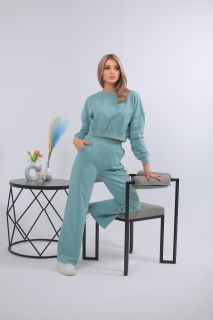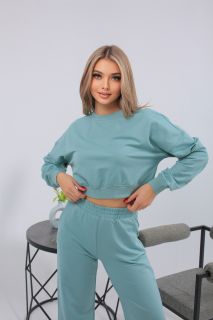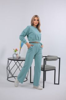Мятный женский костюм с укороченным свитшотом и расклешёнными брюками из мягкого трикотажа. Перейти к описанию