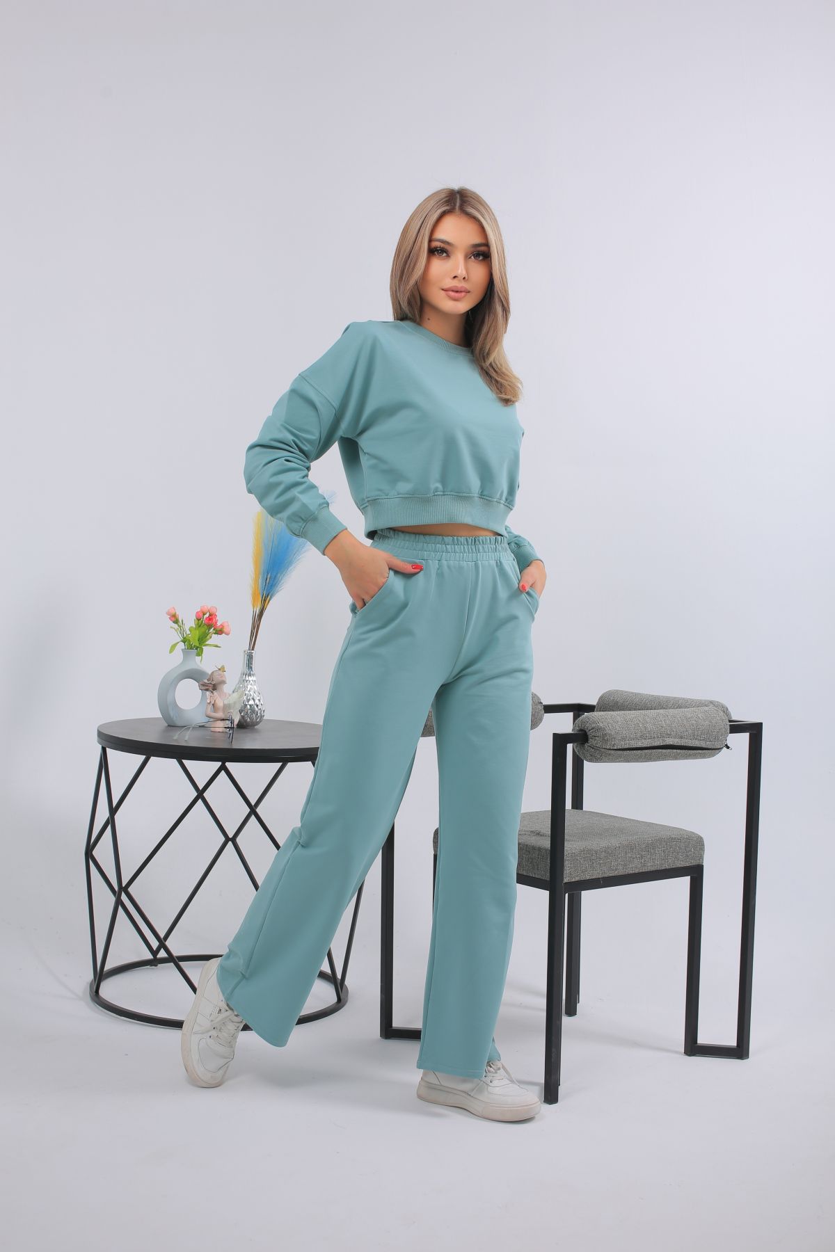Женский костюм нежного мятного оттенка — это идеальный баланс между трендовым дизайном и максимальным комфортом. Укороченный свитшот с манжетами подчёркивает талию, а брюки клеш создают лёгкий и свободный силуэт. Костюм выполнен из мягкого трикотажа, приятного к телу и не сковывающего движений. Идеален для повседневной носки, прогулок, отдыха и поездок. Сочетай с кроссовками, базовой сумкой и расслабленным настроением.