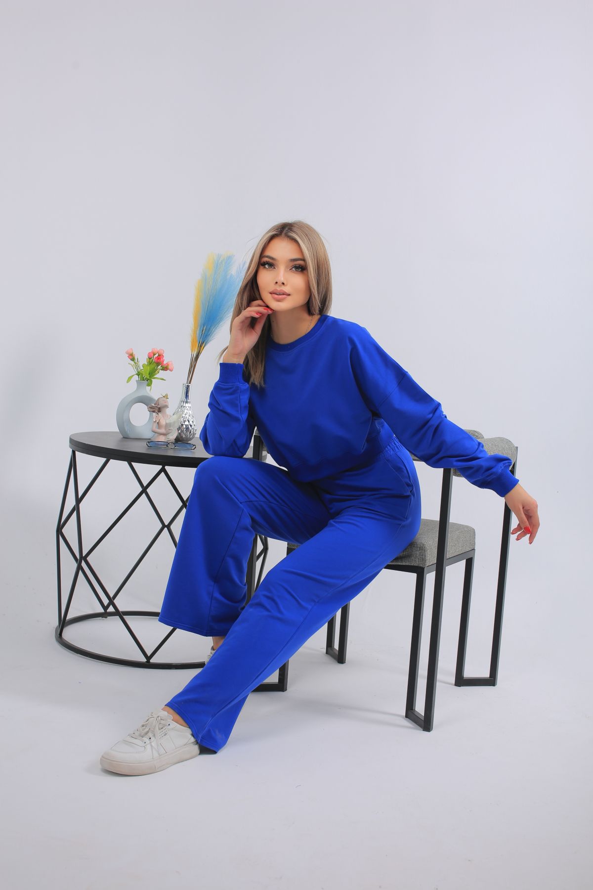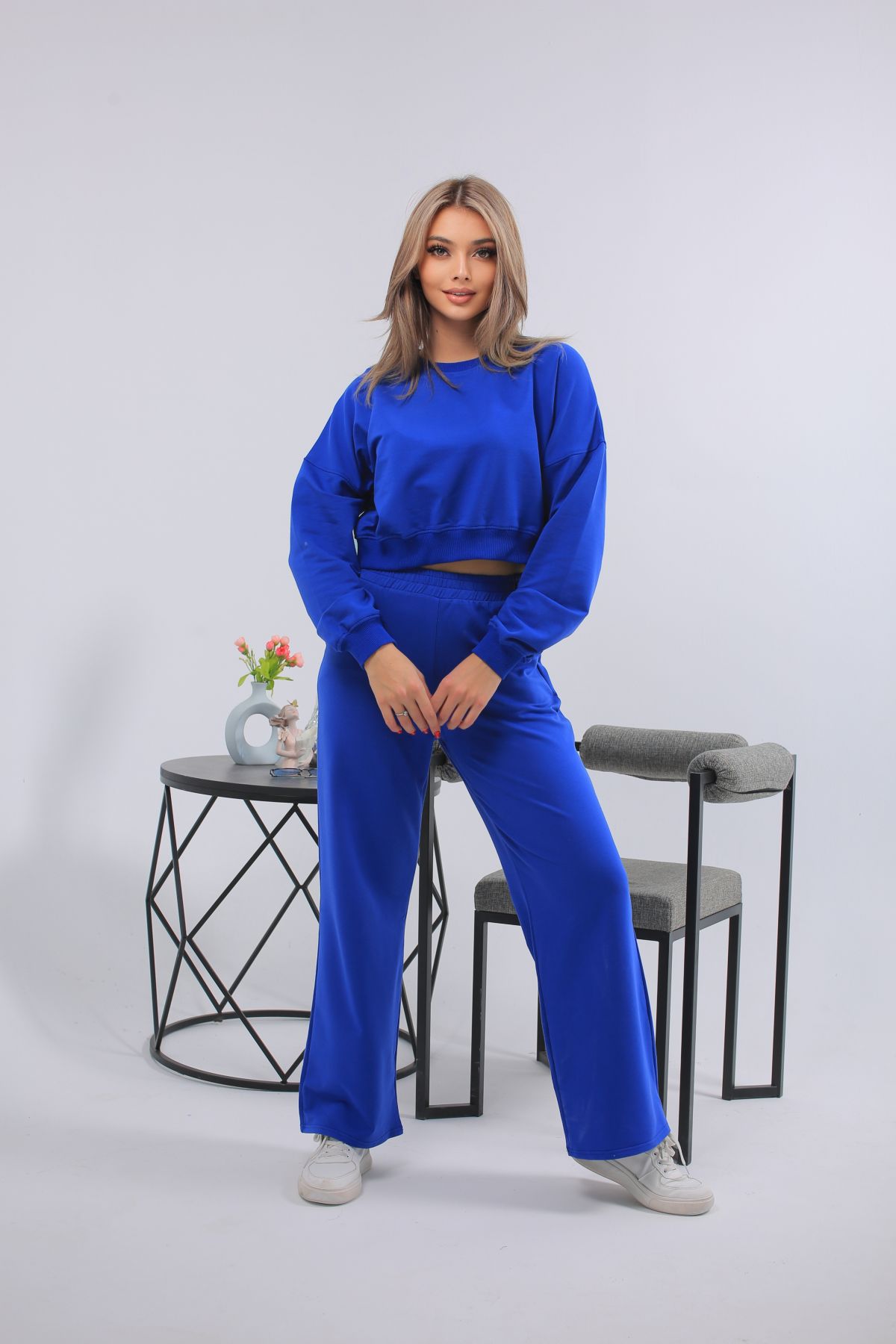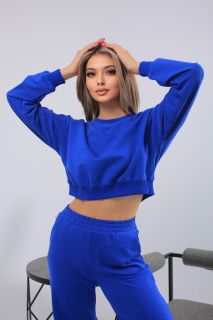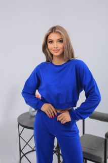 Этот женский костюм насыщенного ультрамаринового оттенка — яркое и уверенное решение для любого повседневного образа. Укороченный свитшот с эластичной резинкой подчёркивает талию, а широкие прямые брюки создают лёгкость и свободу движений. Материал — мягкий трикотаж, обеспечивающий максимальный комфорт. Отлично подойдёт для прогулок, путешествий, домашних дел и активного отдыха. Идеальный выбор для женщин, которые не боятся цвета и ценят стиль.