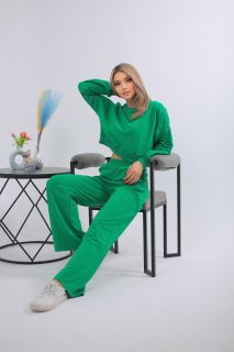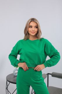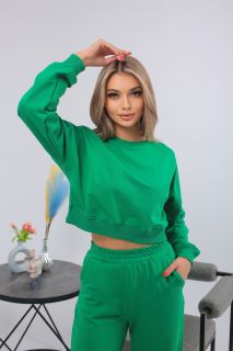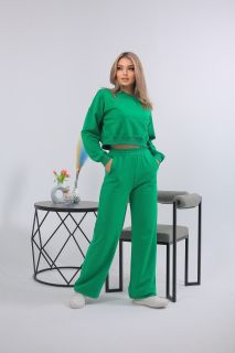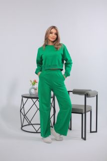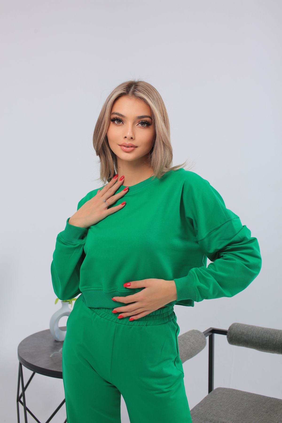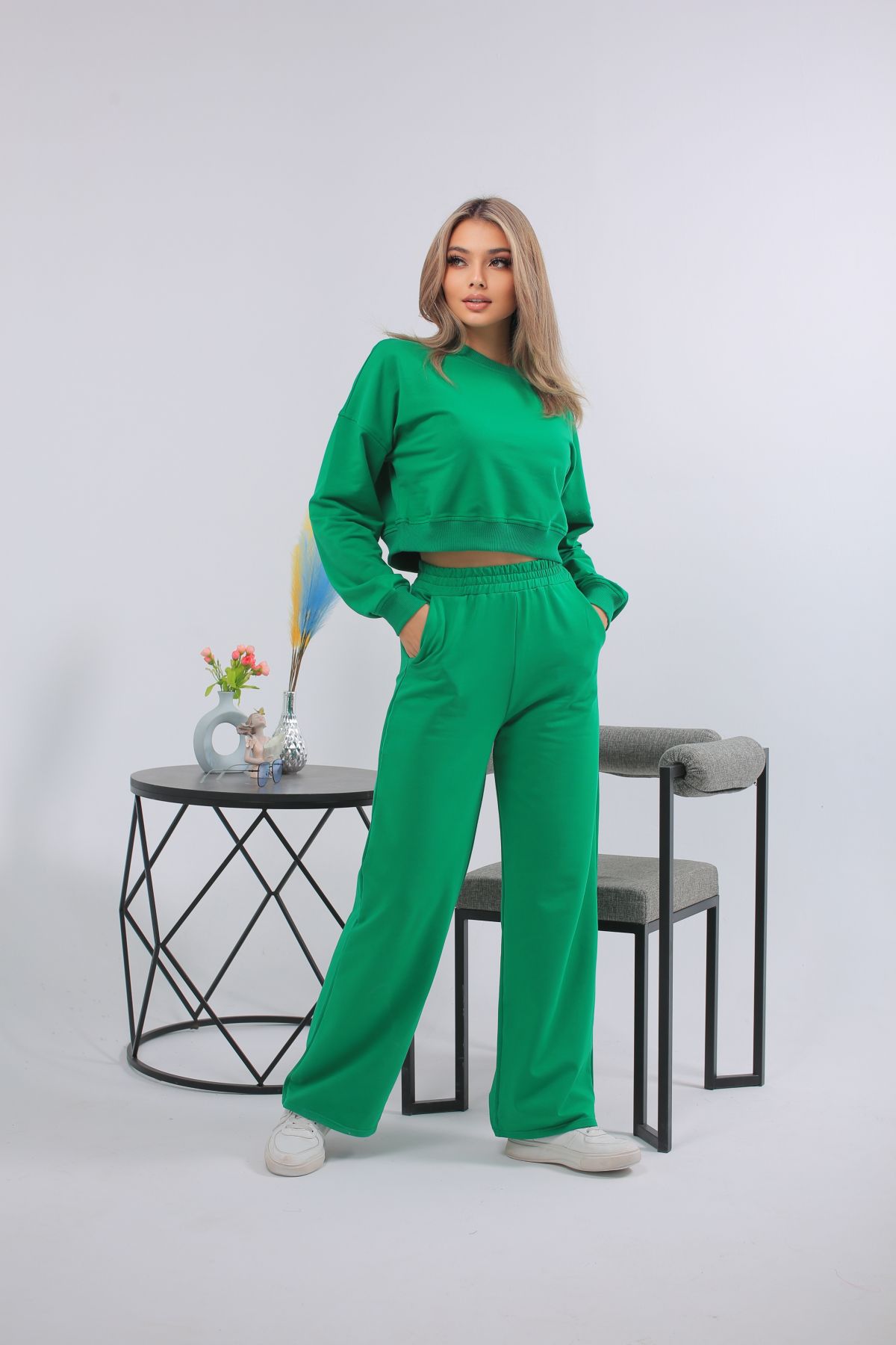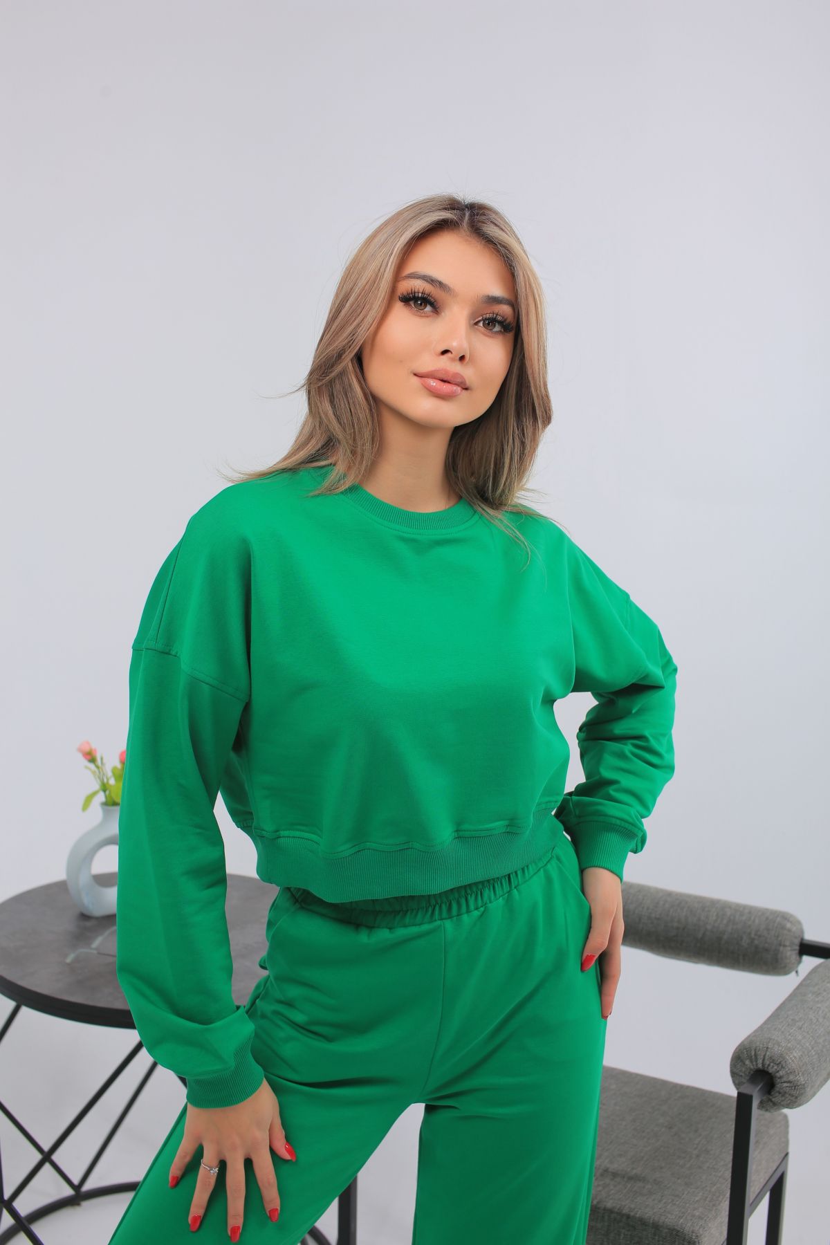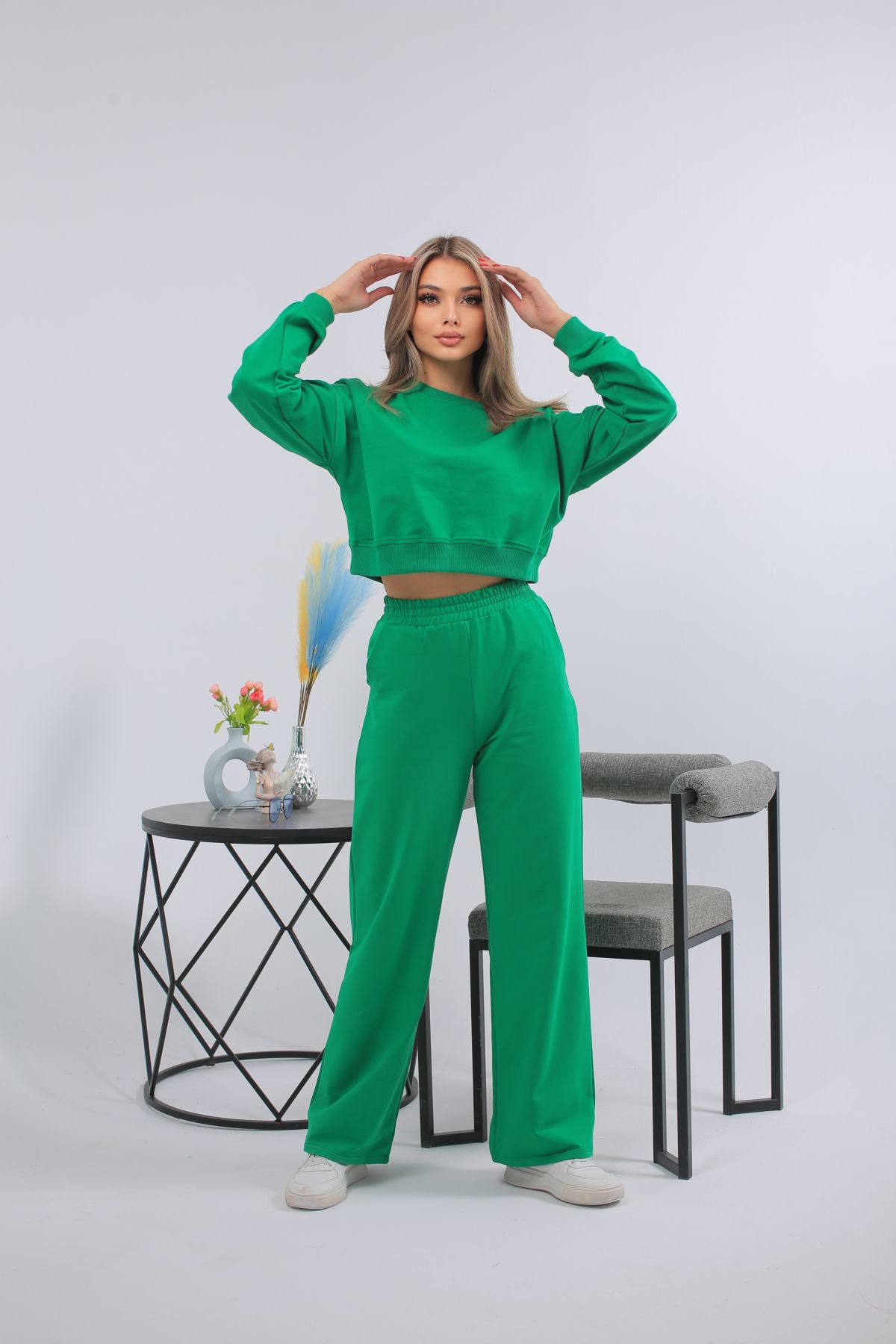 Свежий, яркий и комфортный — этот зелёный костюм с укороченным свитшотом создан для тех, кто любит движение и стиль. Свитшот свободного кроя подчёркивает талию, а широкие брюки обеспечивают максимальную свободу и визуально вытягивают силуэт. Выполнен из мягкого трикотажа, приятного к телу и идеально подходящего для повседневной носки. Отличный вариант для прогулок, активного отдыха и ярких будней. Этот костюм добавит в твой образ нотку бодрящей свежести.