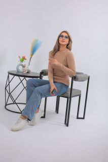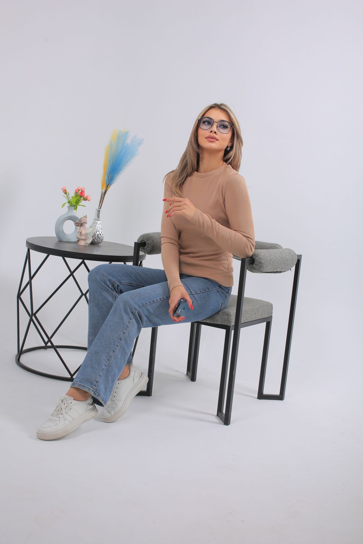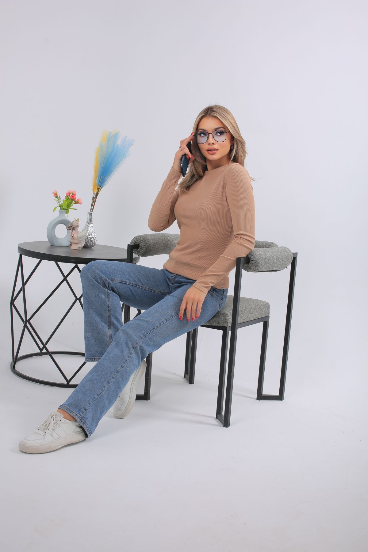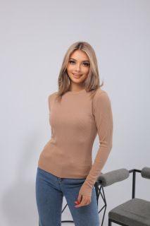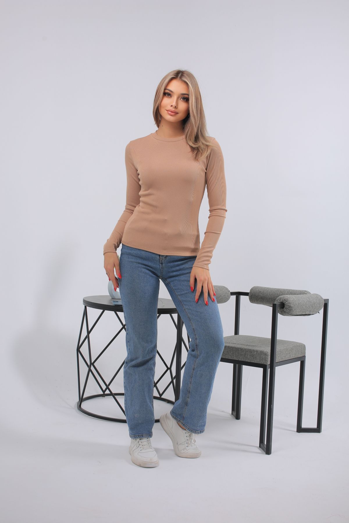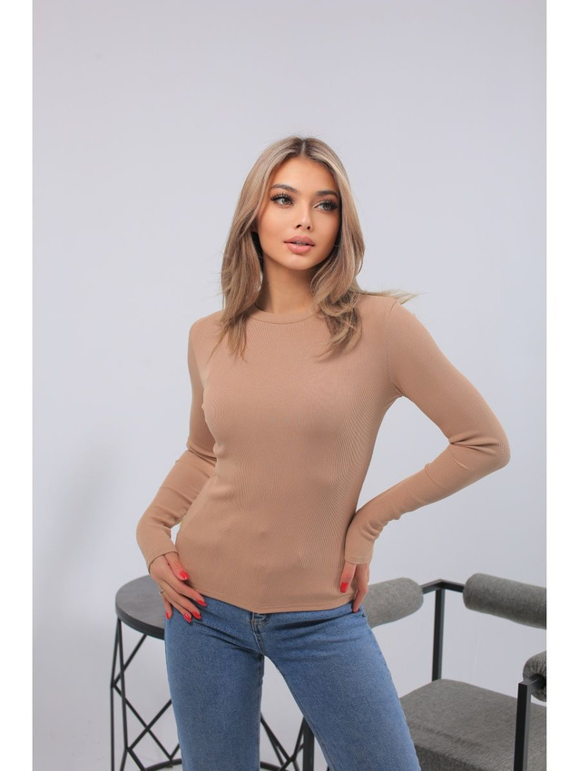 Трикотажный лонгслив карамельного оттенка с длинным рукавом и круглым вырезом. Перейти к описанию