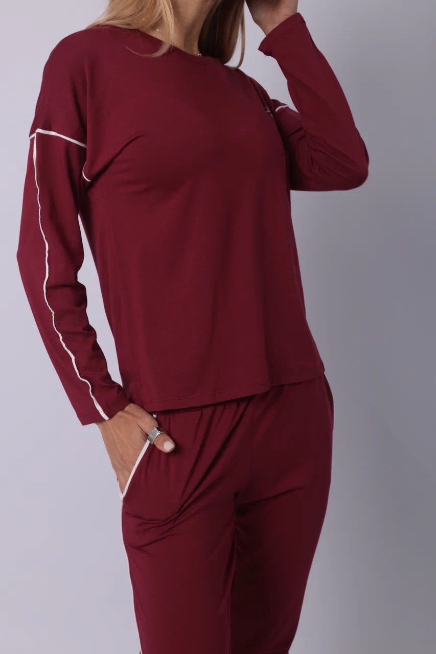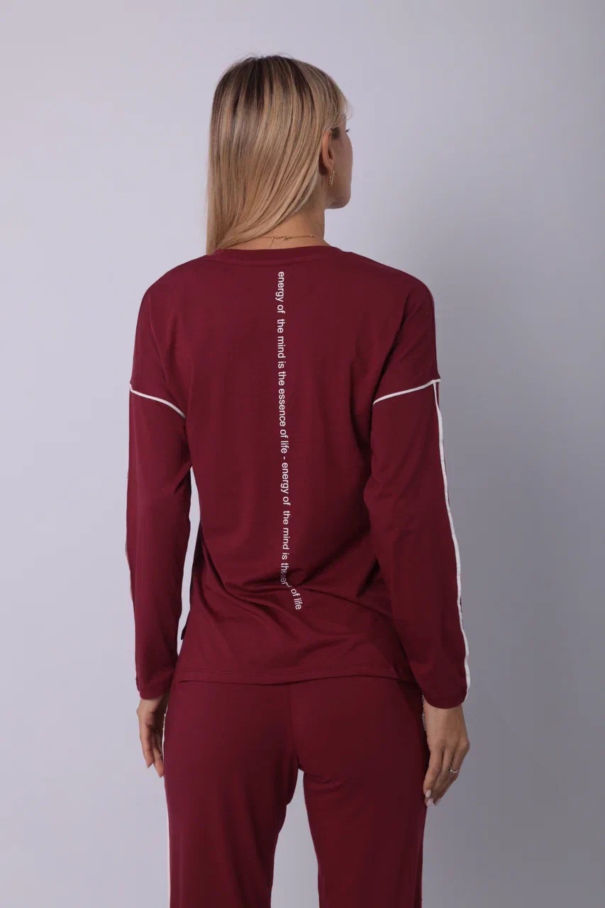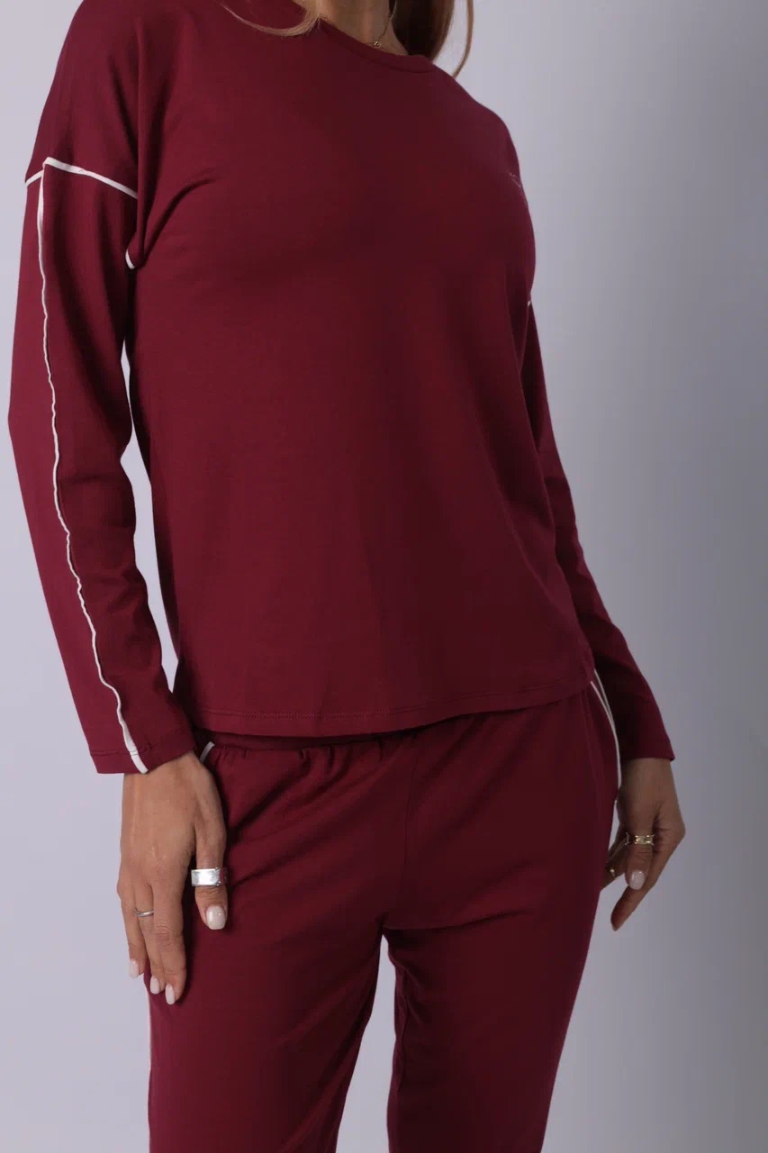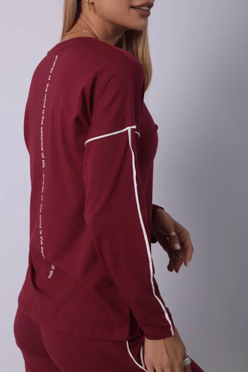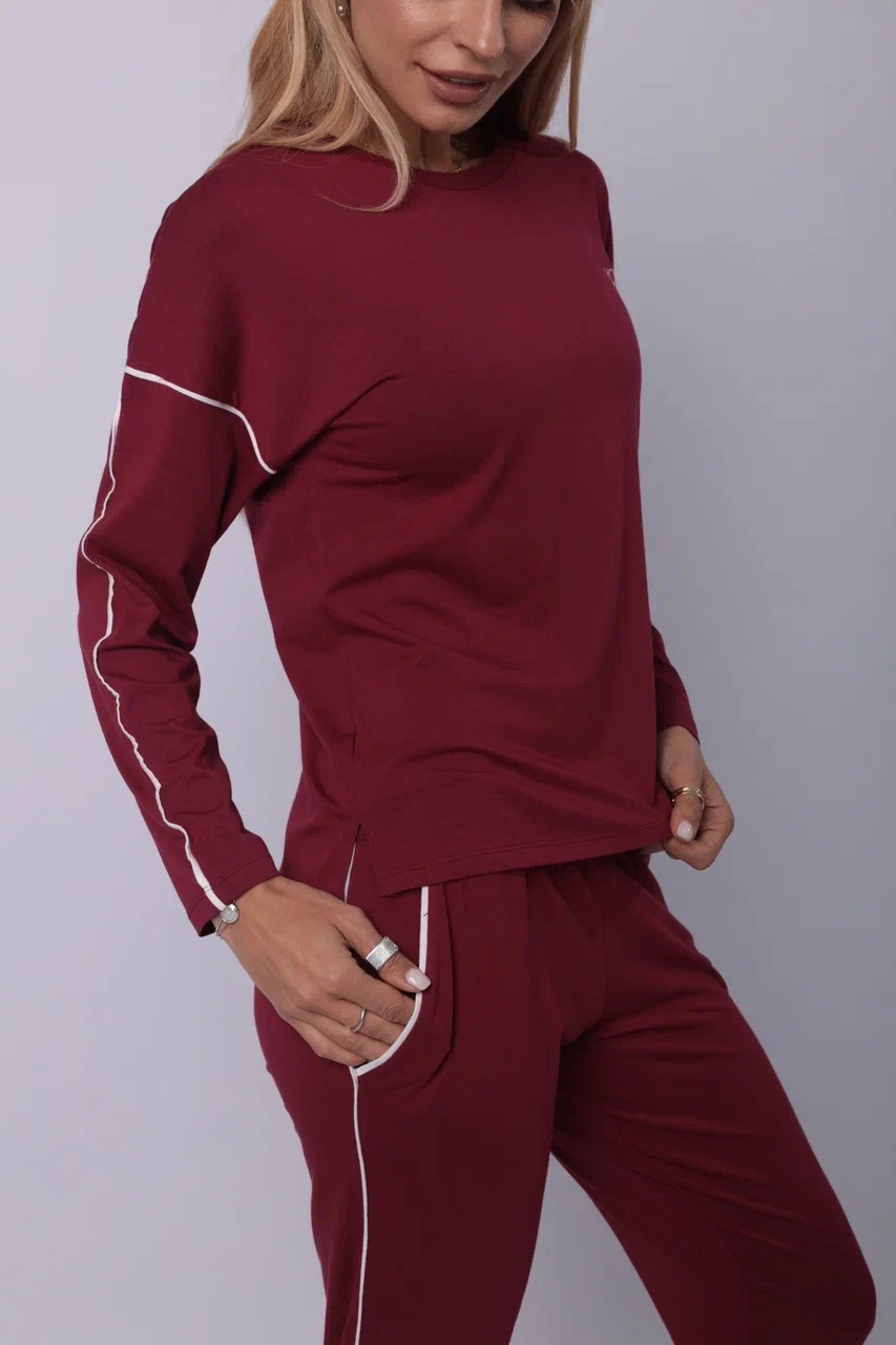 Элегантный спортивный костюм бордового цвета — выбор для тех, кто ценит минимализм с характером. Комплект включает лонгслив с длинным рукавом и прямые брюки на резинке. Акцентные белые полосы на рукавах и штанинах добавляют динамики и подчёркивают спортивный стиль. Материал — мягкий трикотаж, приятный к телу и дышащий. Костюм подойдёт как для прогулок и отдыха, так и для комфортного дня дома. Глубокий оттенок придаёт образу уверенности.
