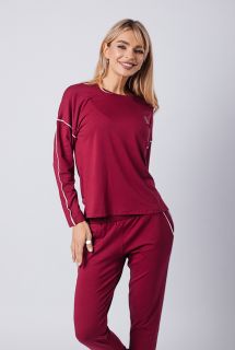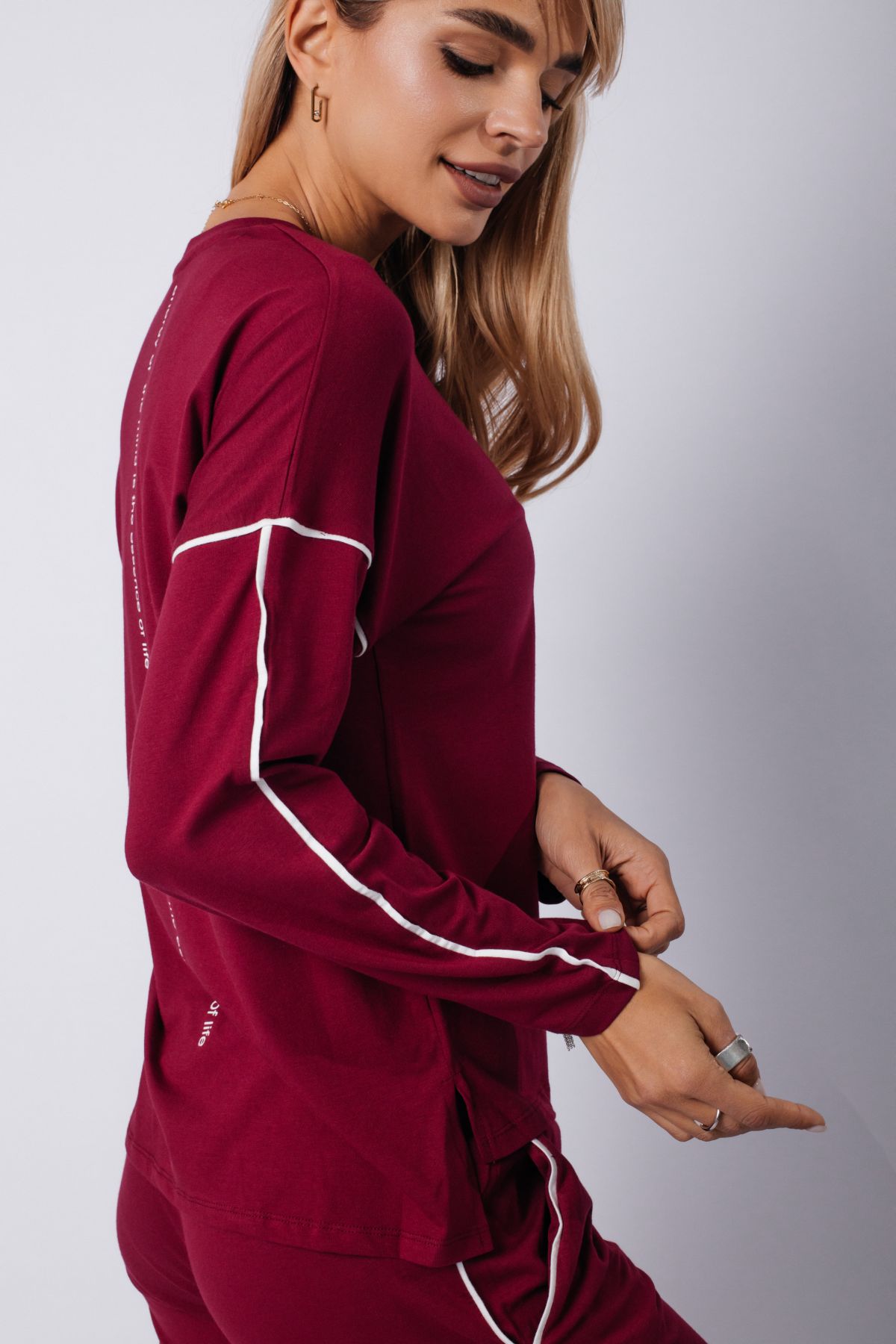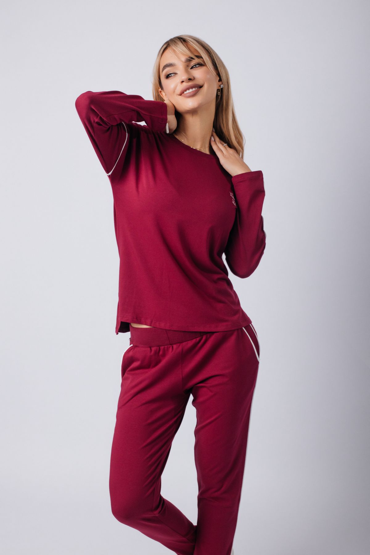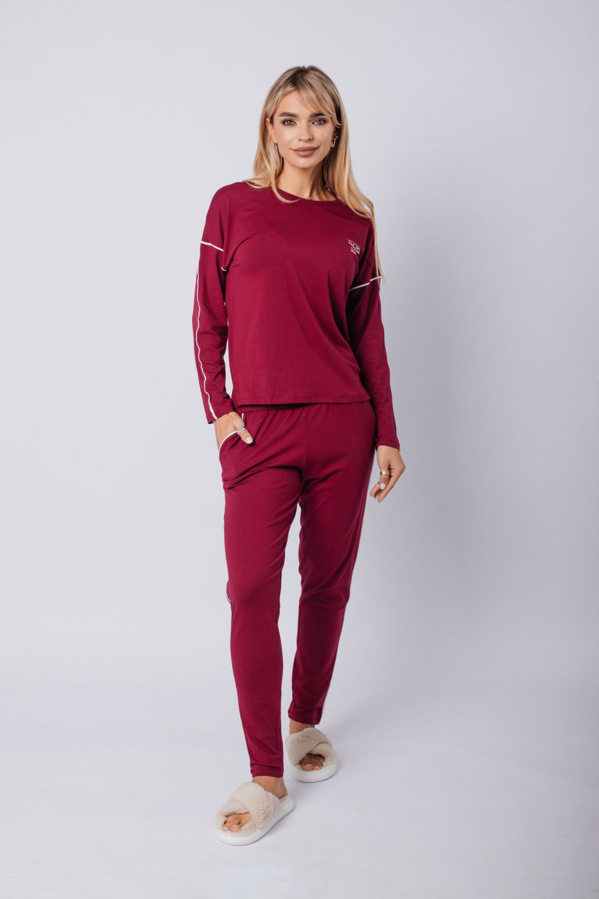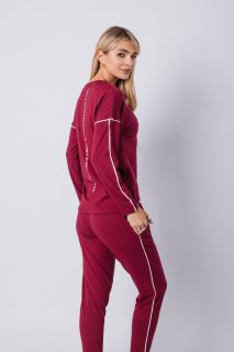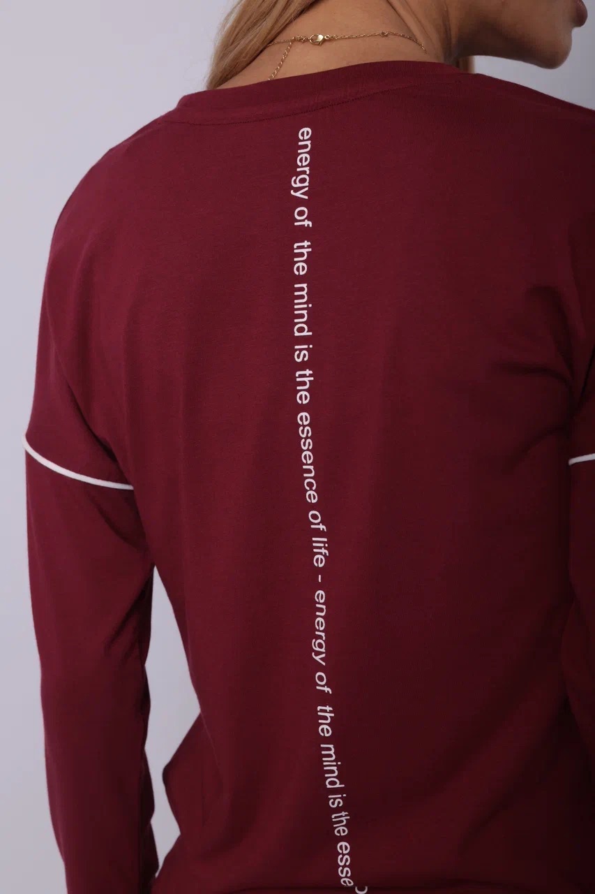Элегантный спортивный костюм бордового цвета — выбор для тех, кто ценит минимализм с характером. Комплект включает лонгслив с длинным рукавом и прямые брюки на резинке. Акцентные белые полосы на рукавах и штанинах добавляют динамики и подчёркивают спортивный стиль. Материал — мягкий трикотаж, приятный к телу и дышащий. Костюм подойдёт как для прогулок и отдыха, так и для комфортного дня дома. Глубокий оттенок придаёт образу уверенности.
