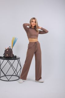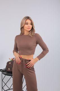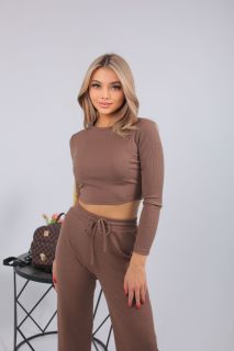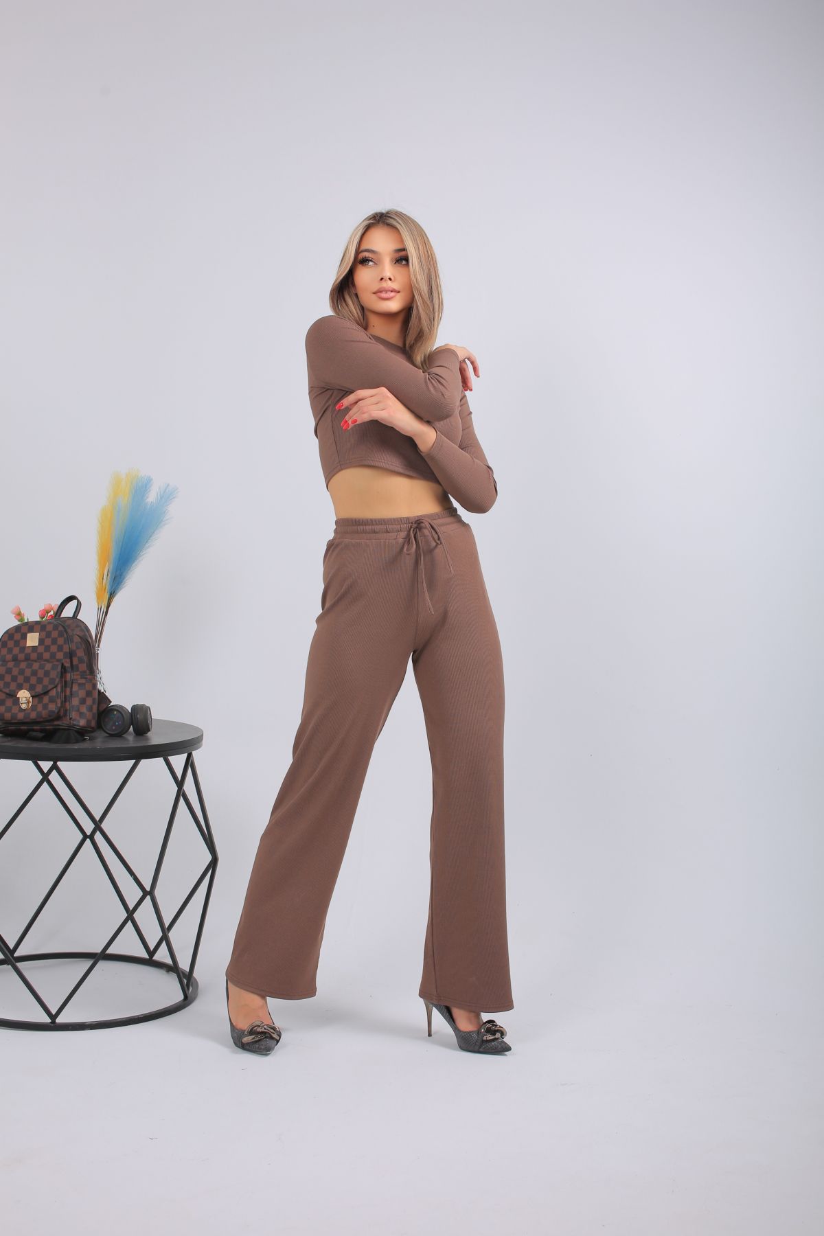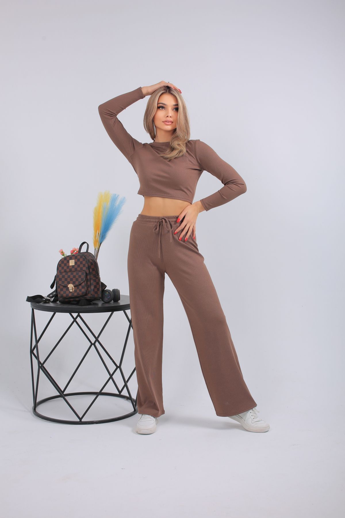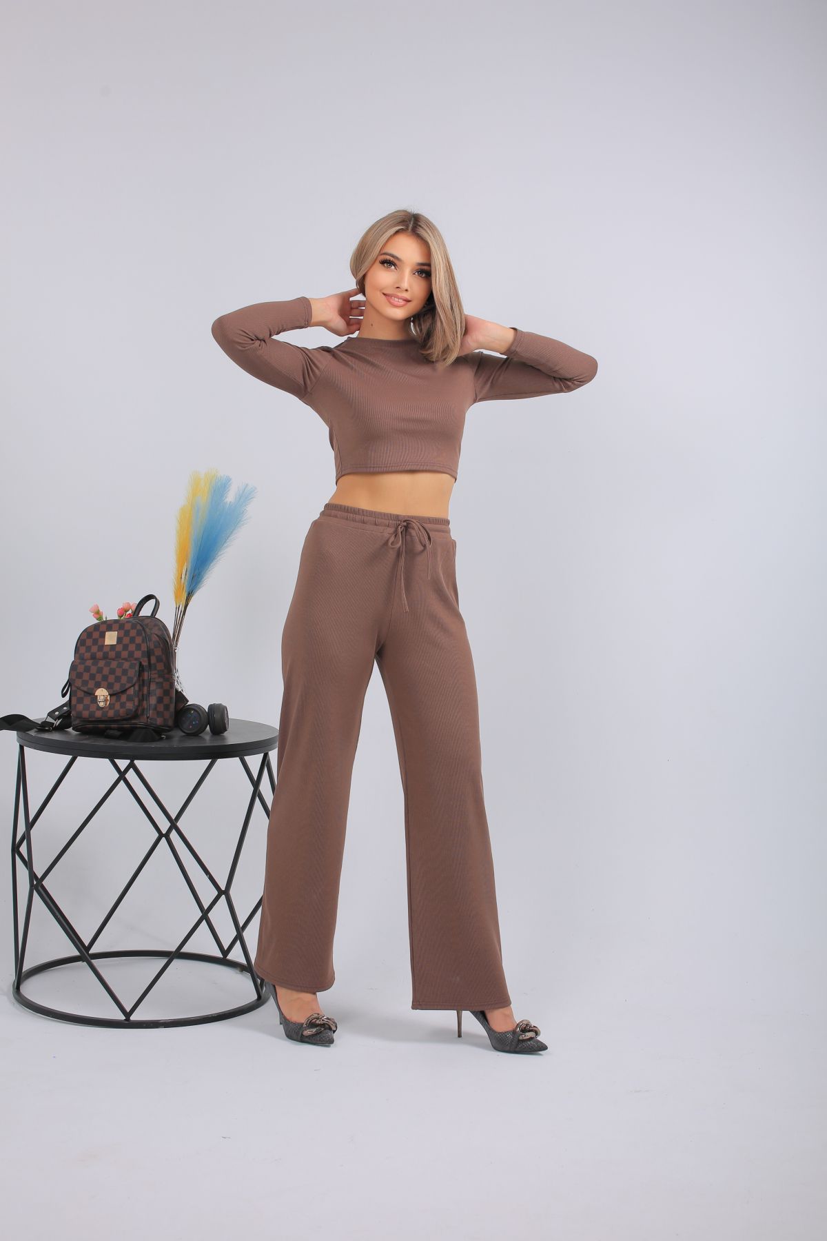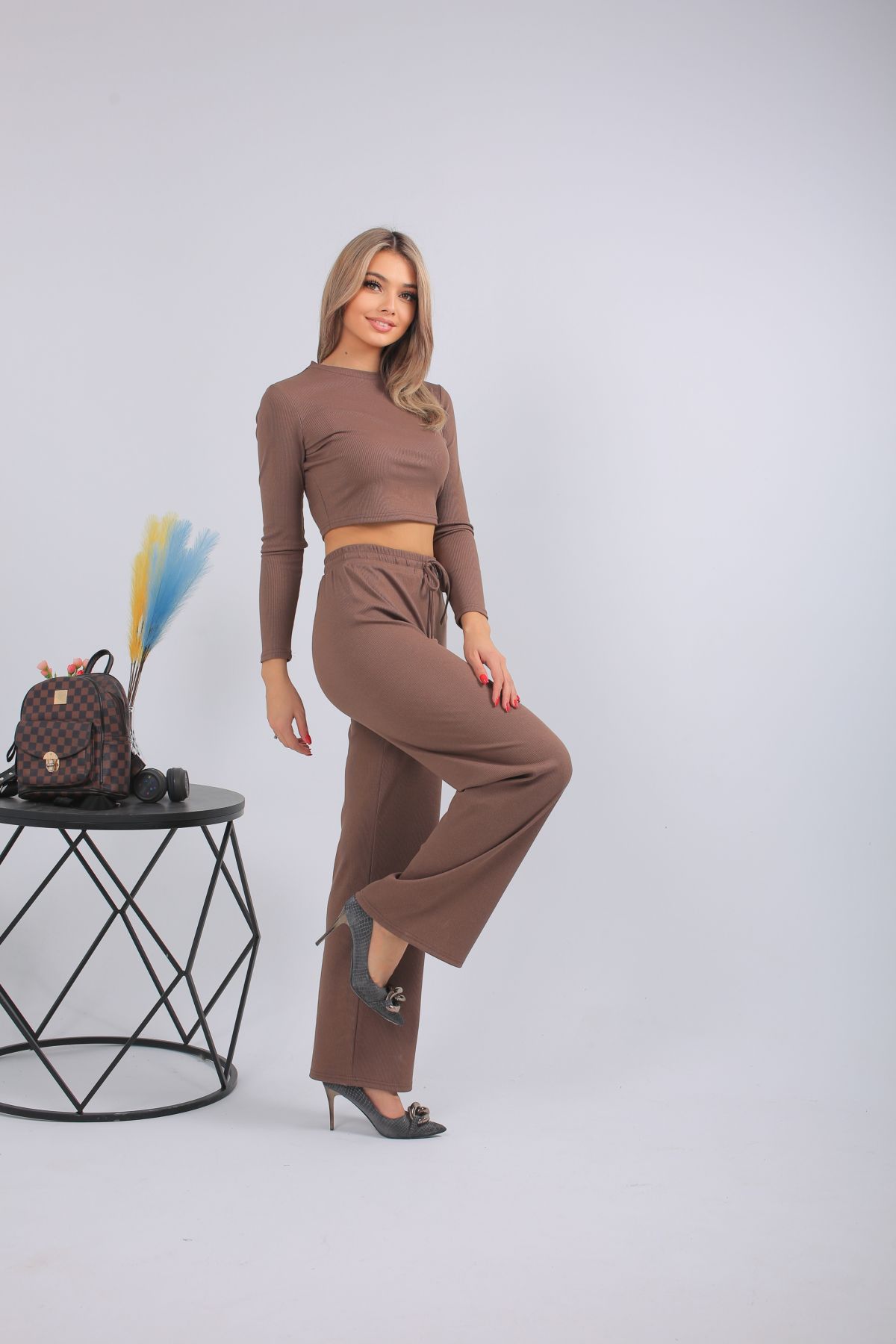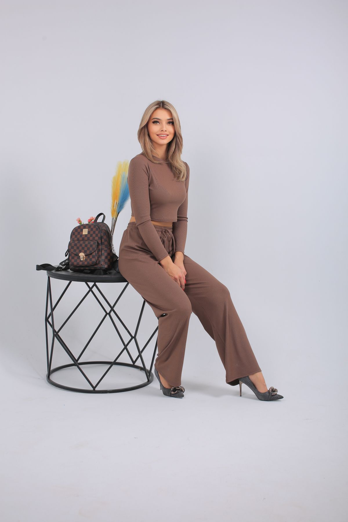 Стильный женский костюм в тёплом коричневом оттенке — идеальное решение для тех, кто ценит комфорт и базовую элегантность. Комплект состоит из лонгслива с длинным рукавом и прямых брюк с эластичной талией. Модель выполнена из мягкого, приятного к телу трикотажа, который не сковывает движений. Универсальный оттенок делает этот костюм отличной базой для повседневного гардероба, прогулок и отдыха.